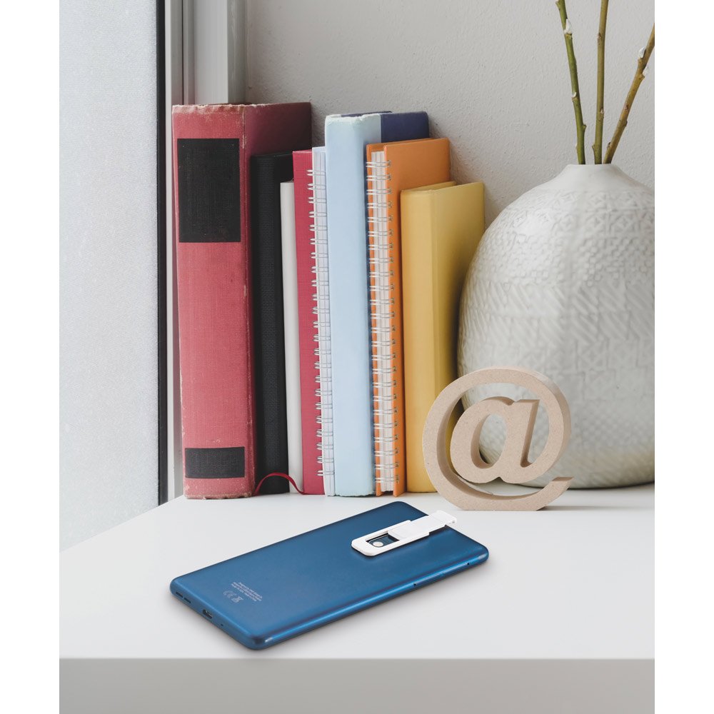 Protetor para webcam em ABS 100% reciclado com tampa deslizante e autocolante no verso. Formato universal para smartphone, tablet, notebook e computador de secretária. 42 x 17 x 2 mm | Aberto: 65 x 17 x 2 mm