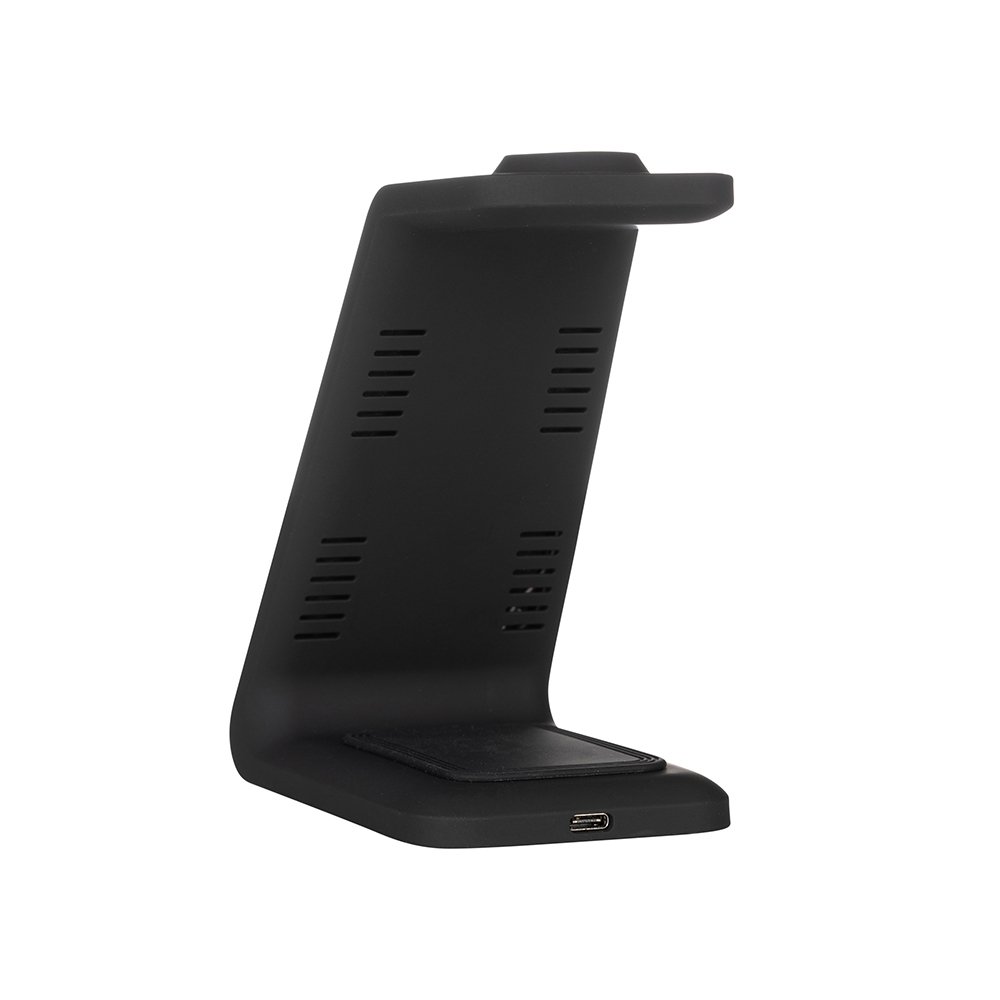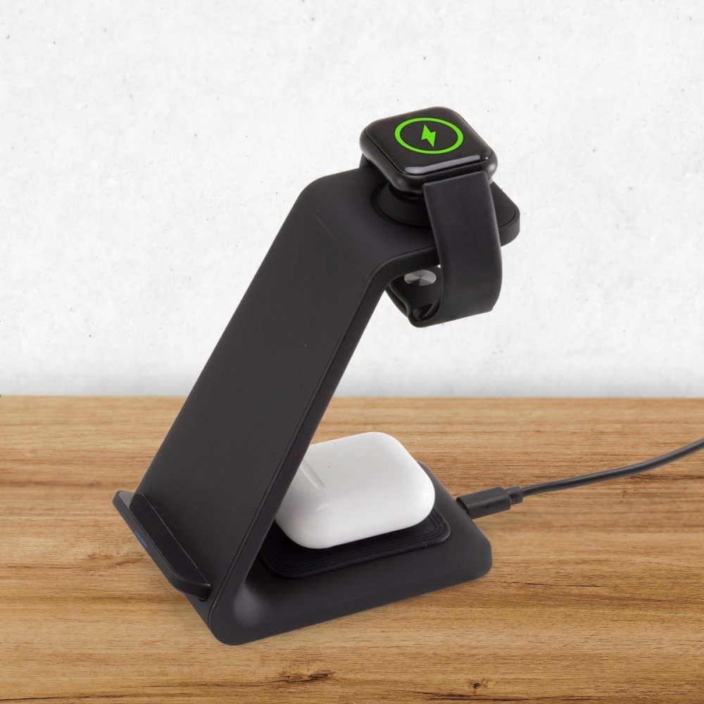 Item 3 em 1? Conheça nossa Base de carregamento via indução. Capaz de carregar simultaneamente celular, Iwatch e fones de ouvido através da tecnologia de indução QI, a base contém frestas para auxilio da circulação de ar, acelerando o resfriamento e proporcionando uma dissipação de calor ideal ao produto. Acompanha cabo USB tipo C.