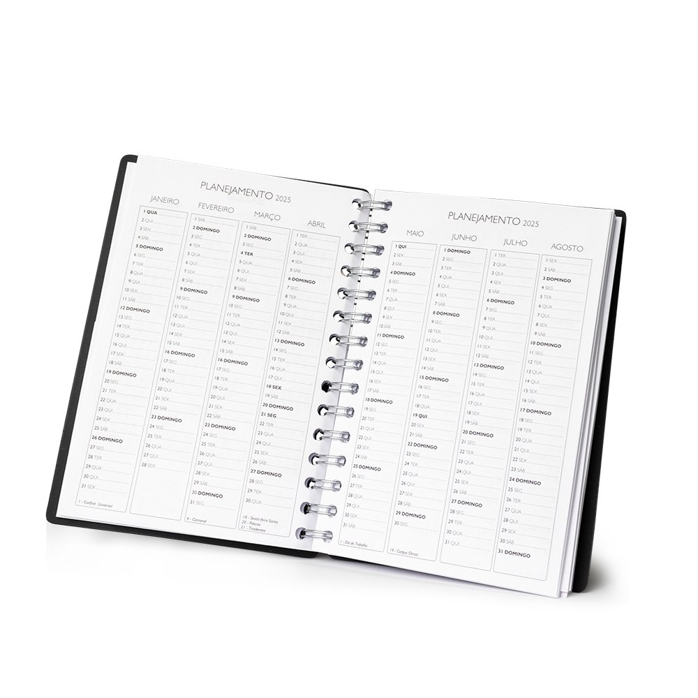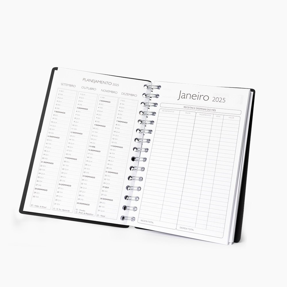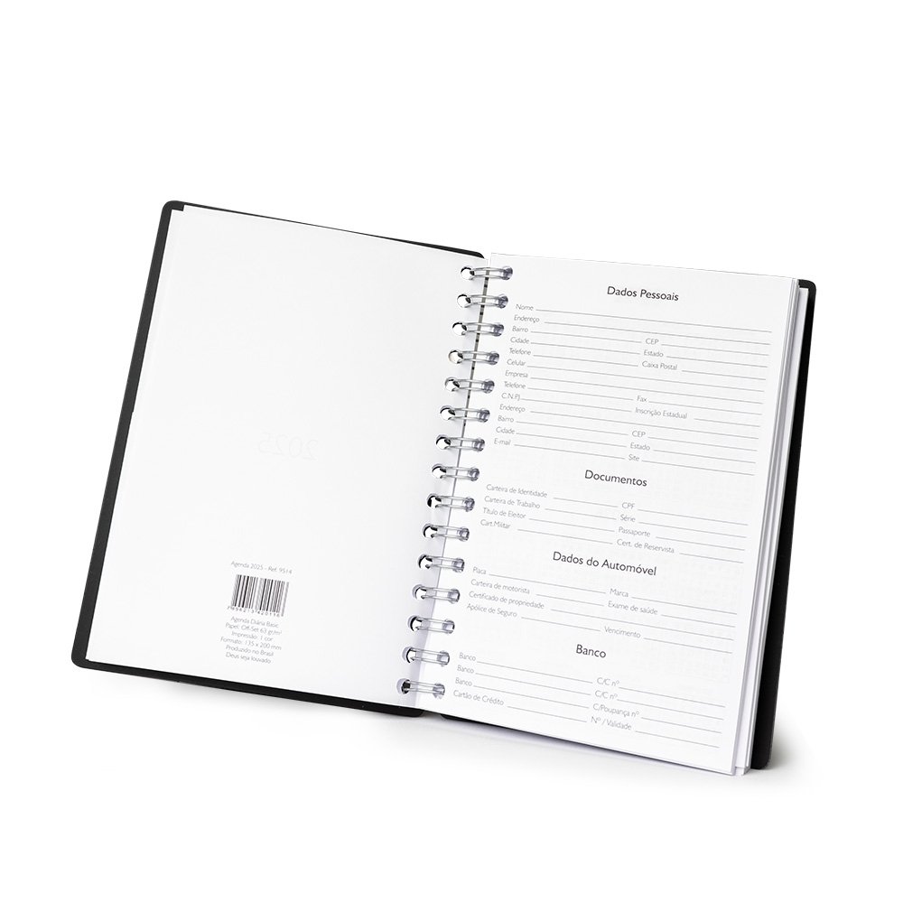 Agenda diária 2025 com espiral, material plástico para lacre. Contém folha com bolso duplo, folhas para preenchimento de dados pessoais, calendários 2024 a 2026, planejamento, receitas e despesas mensais, agenda telefônica, mapa do Brasil, mapa mundi e acompanha régua marca página de papel com 15 cm.