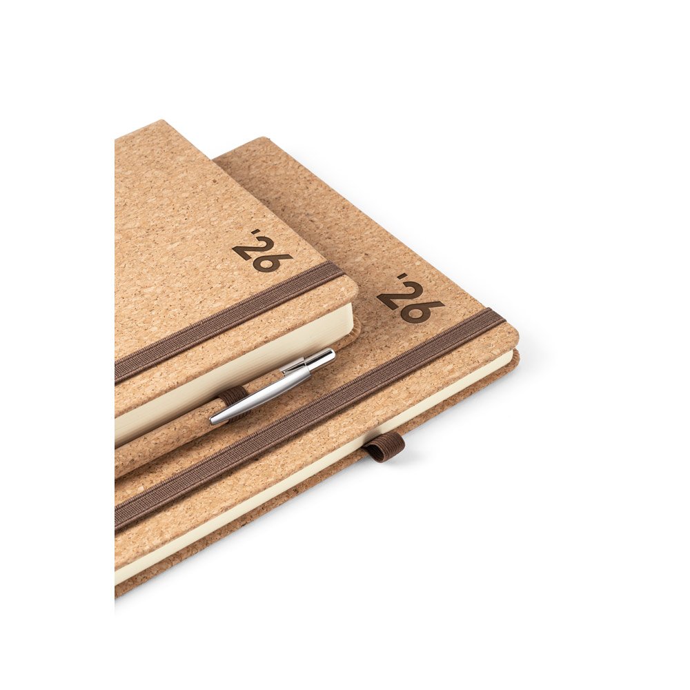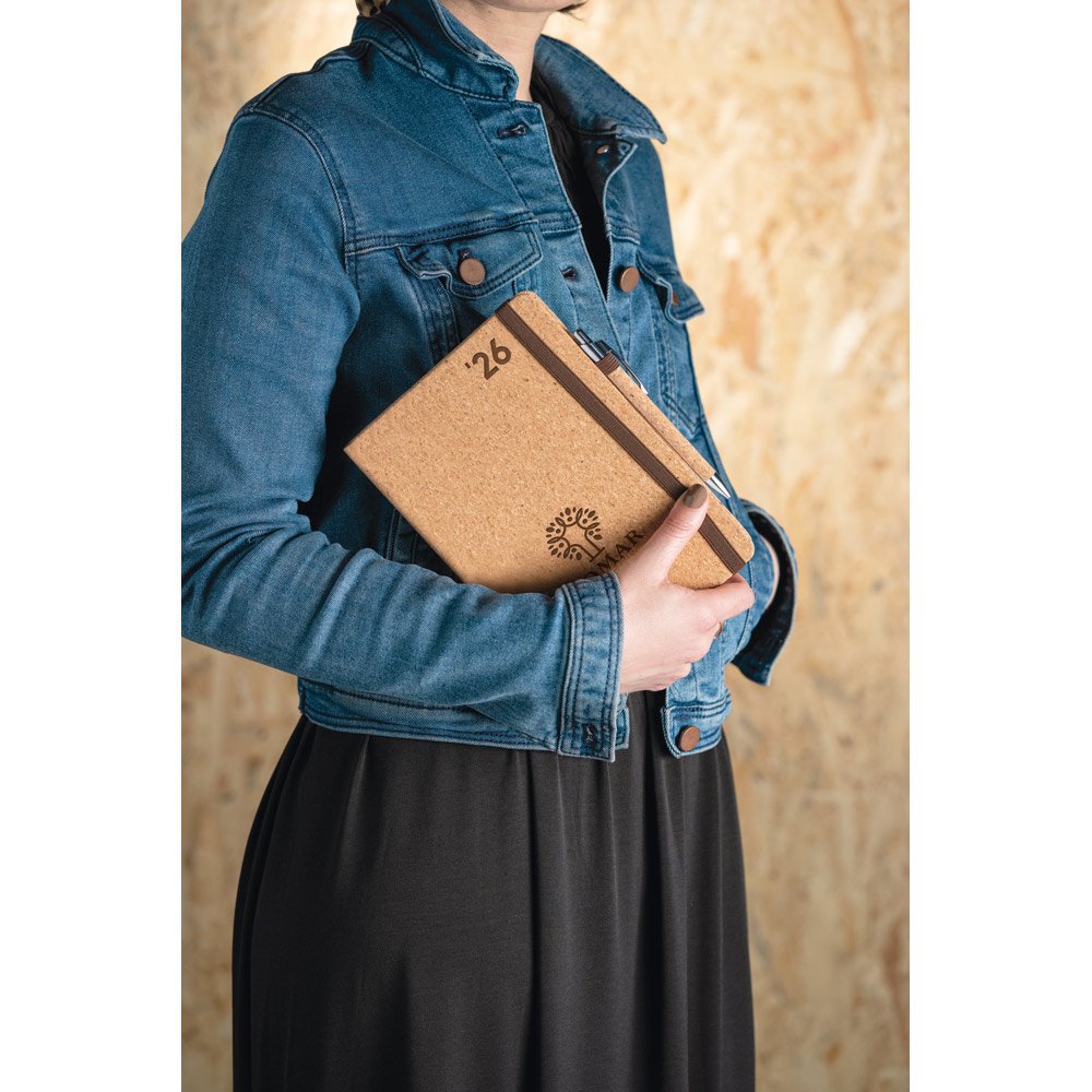 Agenda A5 em cortiça. Possui um suporte para esferográfica (não inclusa), miolo em cor marfim e marcador em fita. Está organizada num plano diário. Fornecida em bolsa de TNT. 148 x 210 mm | Bolsa: 205 x 250 mm
