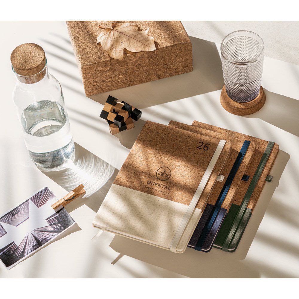 Agenda B5 em cortiça e linho. Possui um suporte para esferográfica (não inclusa), marcador em fita e elástico para fecho na mesma cor. Está organizada num plano diário. Fornecida com bolsa de TNT. 148 x 210 mm | Bolsa: 205 x 250 mm