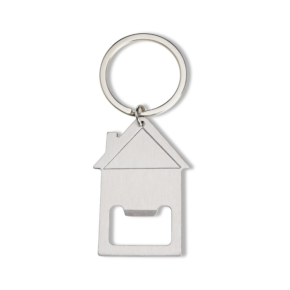 Chaveiro abridor metálico formato casa.
