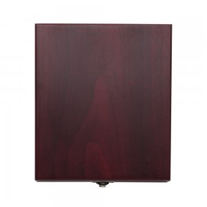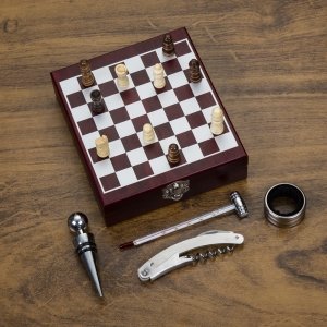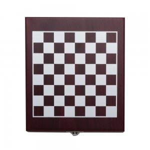 Kit vinho formato xadrez: Material em MDF vinho com desenho de tabuleiro superior. Parte frontal com trava de metal e parte traseira com dobradiças; compartimento interno revestido com espuma; possui 32 peças de xadrez sendo 16 marfim e 16 marrom. Possui abridor saca rolhas, wine collar, tampa de bico e termômetro.