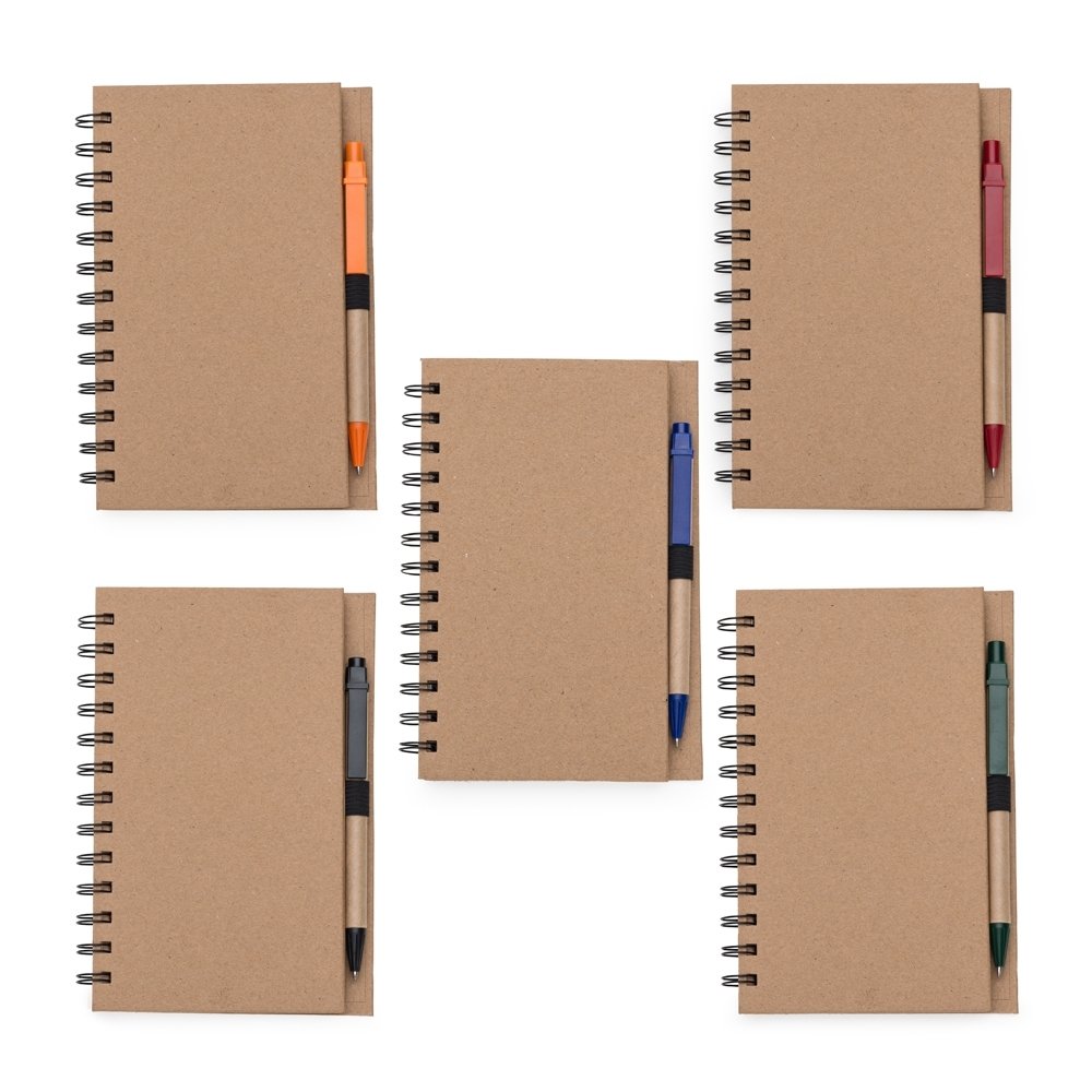 Bloco de anotações ecológico com caneta e autoadesivos. Bloco com dois suporte internos para cartão, possui cinco blocos autoadesivos com 20 folhas cada, bloco laranja e bloco amarelo com aproximadamente 20 folhas cada. Possui aproximadamente 70 folhas brancas pautadas e caneta de papelão de clip e ponteira plástica.