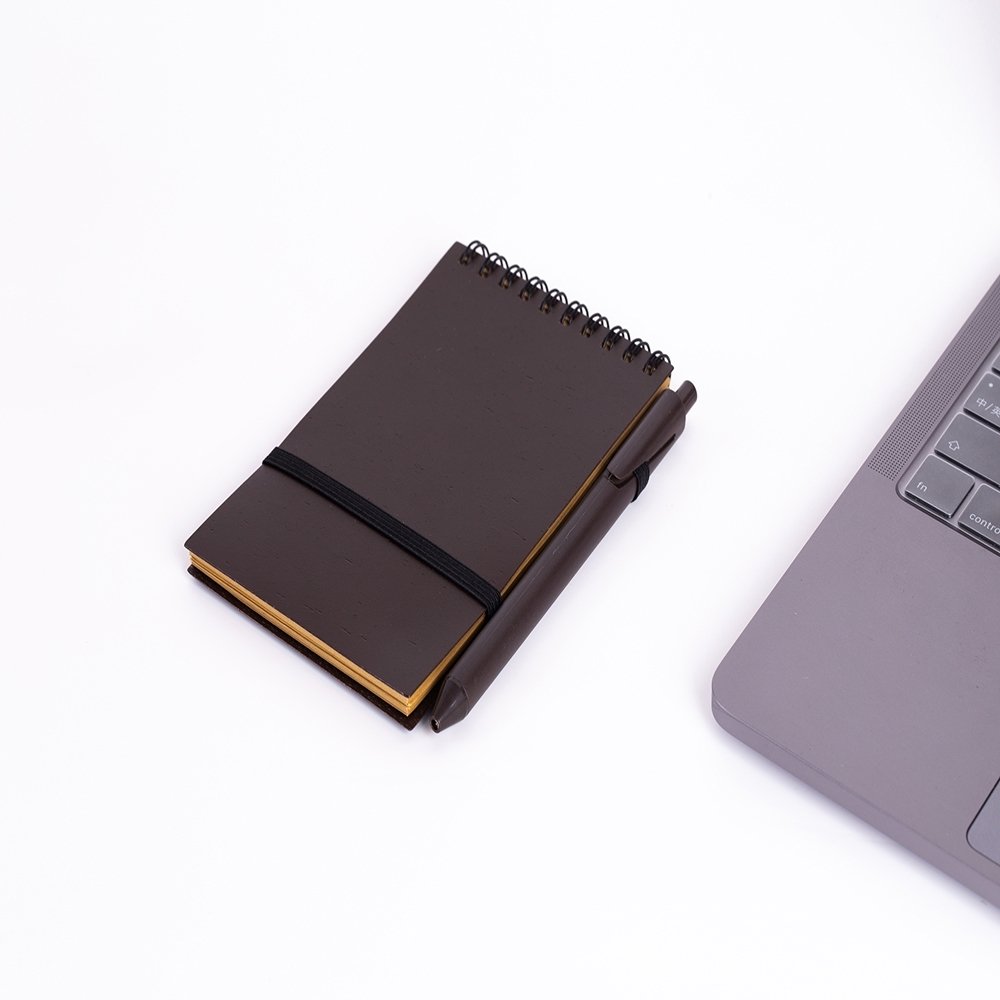 Bloco de anotações ecológico com caneta plástica: Bloco de anotações com elástico e suporte para caneta, produzido com grãos de café e polipropileno, aproximadamente 60 folhas marrons sem pauta, caneta plástica com acionamento por clique.
