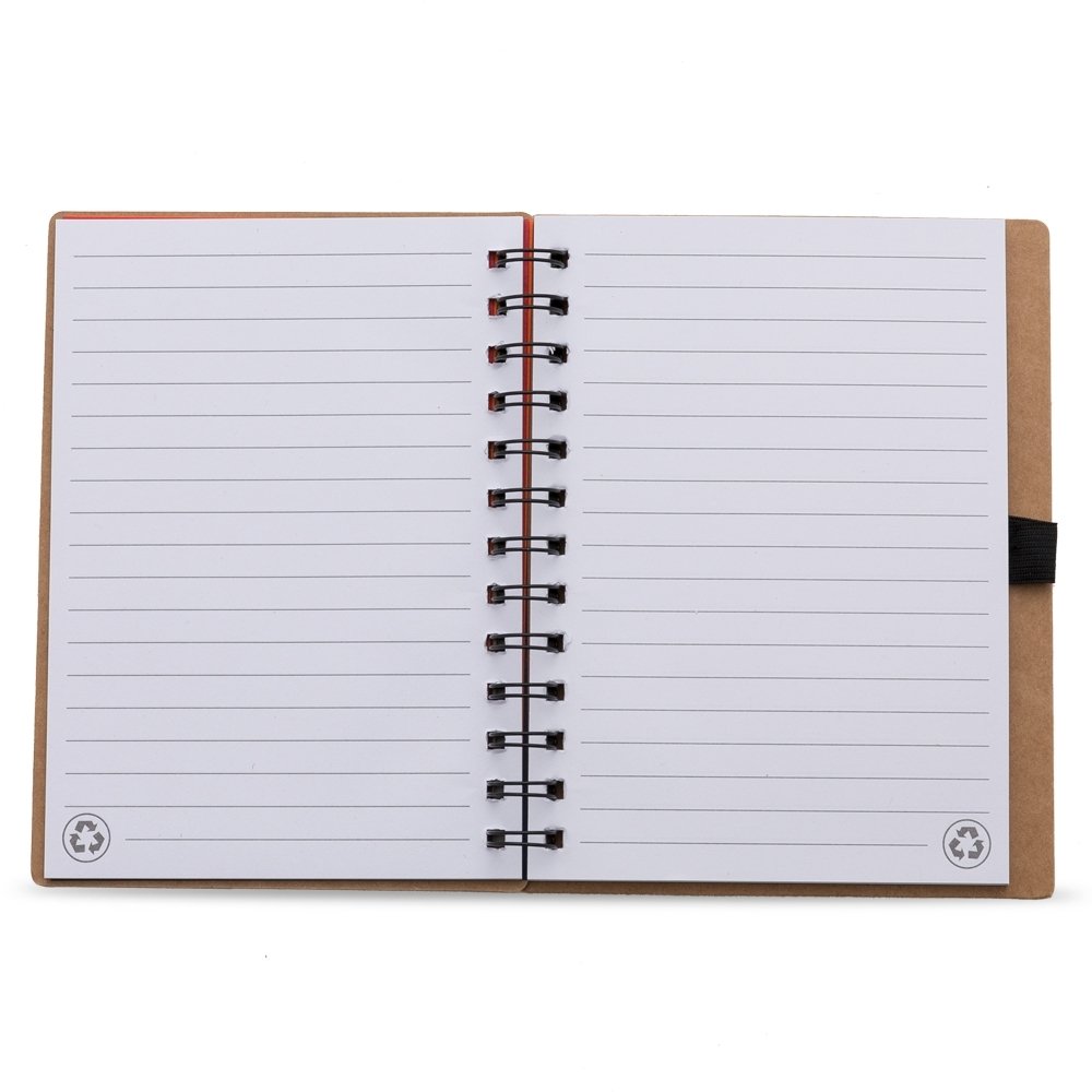 Bloco de anotação ecológico com símbolo reciclado na capa, acompanha as folhas: vermelha, amarela, laranja, azul, verde e preto, possibilitando deixar a cor desejada como fundo do logo reciclado. Possui aproximadamente 70 folhas brancas pautadas com logo reciclado na lateral inferior das folhas, possui também elástico suporte para caneta(não acompanha caneta).