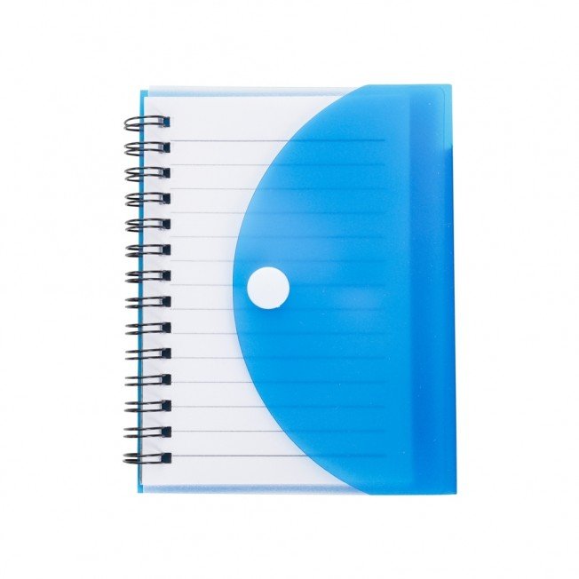 [vc_row][vc_column width=”2/3″]n[vc_column_text]Bloco de anotações plástico com capa colorida e botão, possui espiral preto e parte interna transparente. Tem aproximadamente 66 folhas.nMedidas aproximadas para gravação (CxL): 8 cm x 5 cmTamanho total aproximado (CxL): 13,6 cm x 10,2 cmPeso aproximado (g): 70n