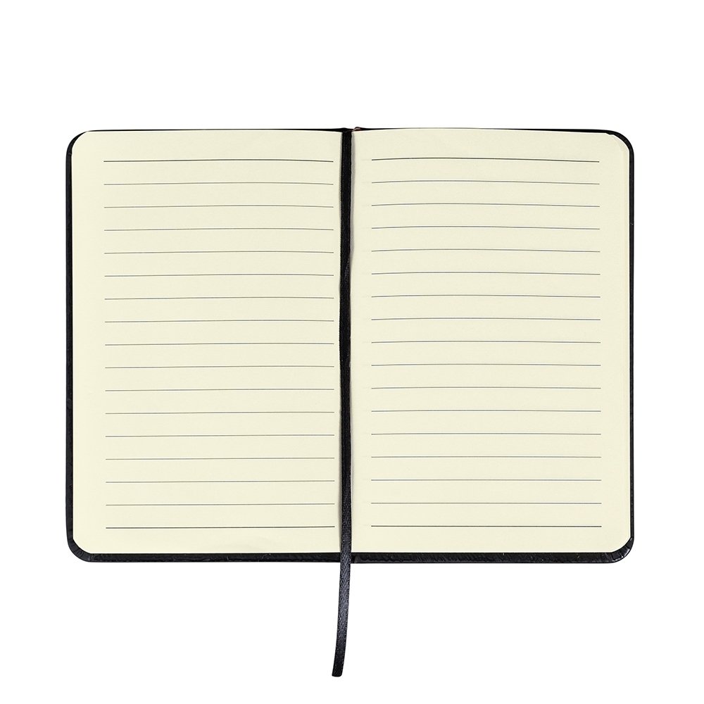 Caderneta emborrachada com marcador de página em cetim e fita elástica para fechar. Contém aproximadamente 80 folhas amareladas com pauta.