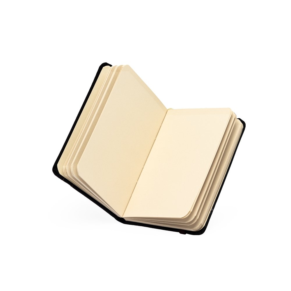 Caderneta emborrachada com marcador de página em cetim e fita elástica de nylon para fechar. Contém aproximadamente 78 folhas marfim sem pautas. Altura :  15,1 cm Largura :  9,9 cm Espessura :  1,4 cm Medidas aproximadas para gravação (CxL):  12,5 cm x 4,5 cm Peso aproximado (g):  139