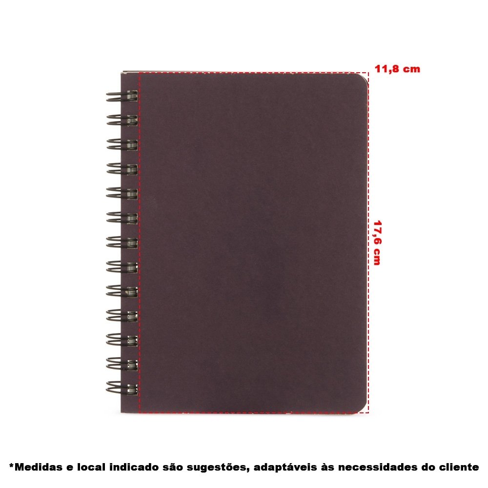 Caderneta capa dura em kraft com wire-o. Contém aproximadamente 80 folhas brancas pautadas.
