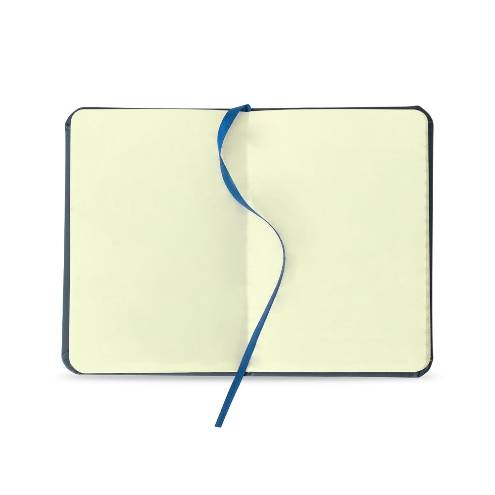 Caderneta tipo moleskine emborrachado de frente e verso liso, marcador de página em cetim e fita elástica para fechar. Contém aproximadamente 96 folhas amarelas sem pauta.