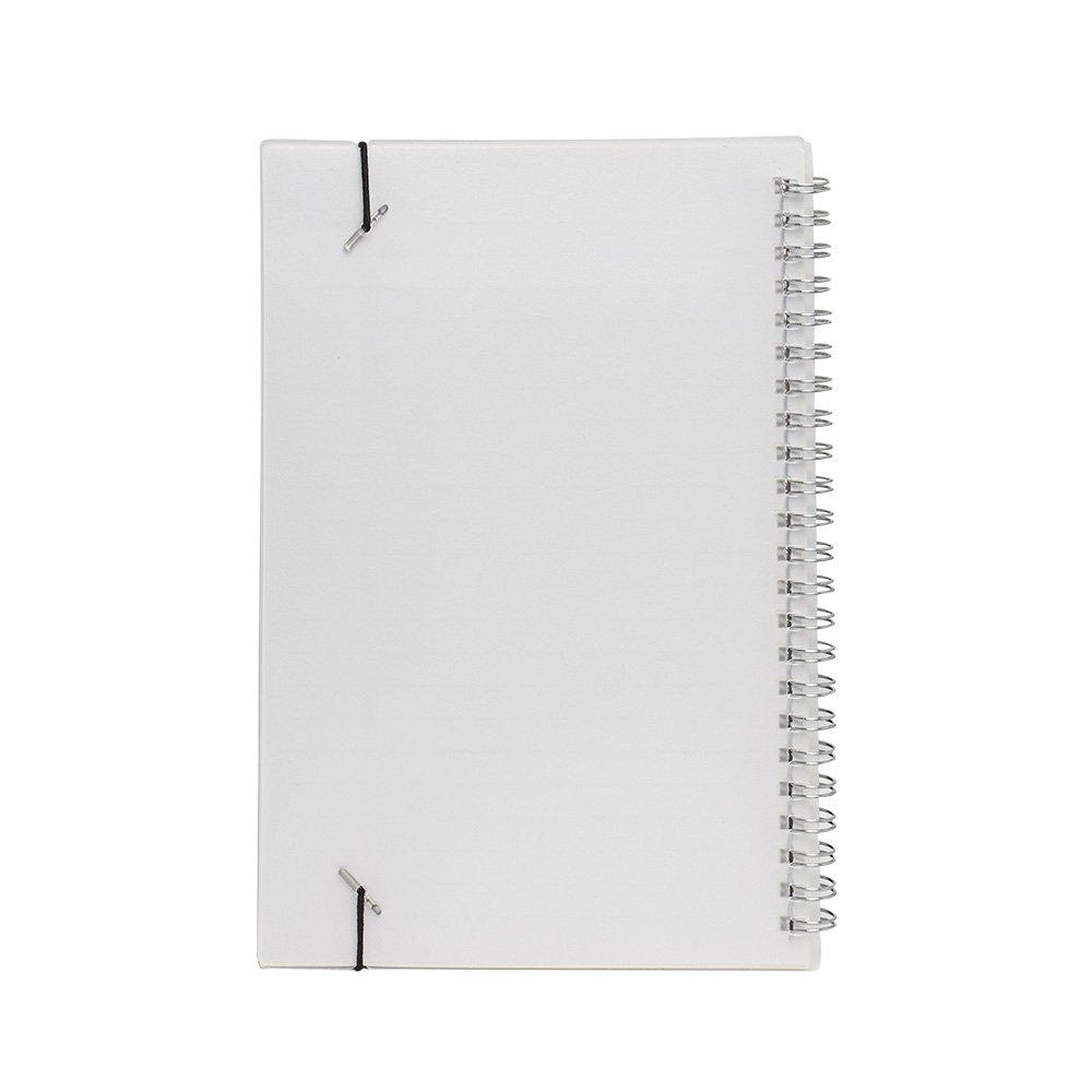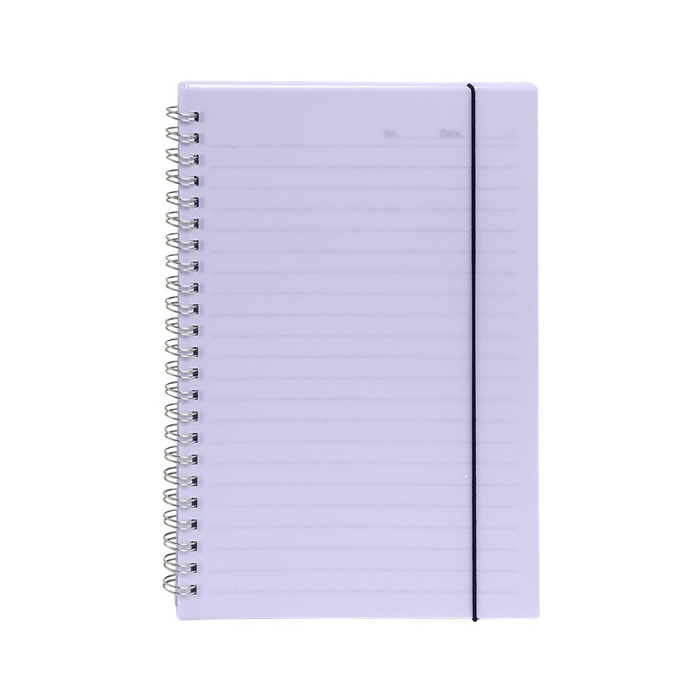Caderno A5 com capa plástica e elástico para lacre, contém aproximadamente 80 folhas marfim com pauta.
