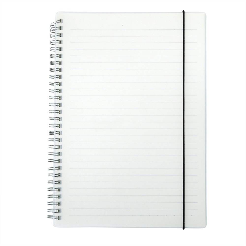 Caderno B5 com capa plástica e elástico para lacre, contém aproximadamente 80 folhas marfim com pauta.