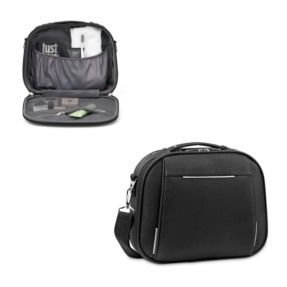 Mala de cosméticos em 600D e EVA com fecho duplo. Compartimento frontal semi-rígido e interior forrado com 2 bolsos. A mala tem uma banda para transporte em trolley de viagem e alça ajustável em webbing. 305 x 250 x 85 mm