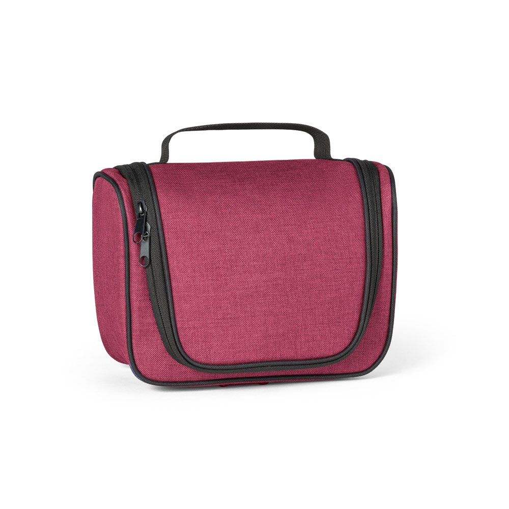 Bolsa de cosméticos em 600D de alta densidade. O compartimento principal tem zíper duplo e revestimento interior em 210D. Contém vários bolsos interiores e gancho no topo para pendurar. 230 x 180 x 105 mm