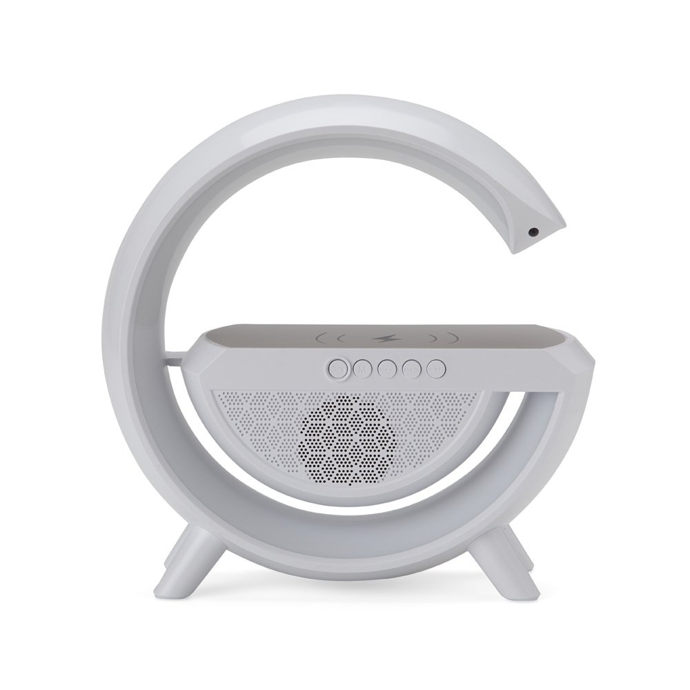 Caixa de som com carregador por indução e luminária. Possui 6 modos de iluminação, opera nos modos bluetooth, rádio FM, auxiliar P2, USB e TF (cartão MicroSD). Para desfrutar do carregamento por indução (sem fio) é fundamental que o celular possua a tecnologia QI, o produto só armazena bateria para funcionamento próprio, para funcionar a indução precisa estar conectado a uma fonte de energia.
