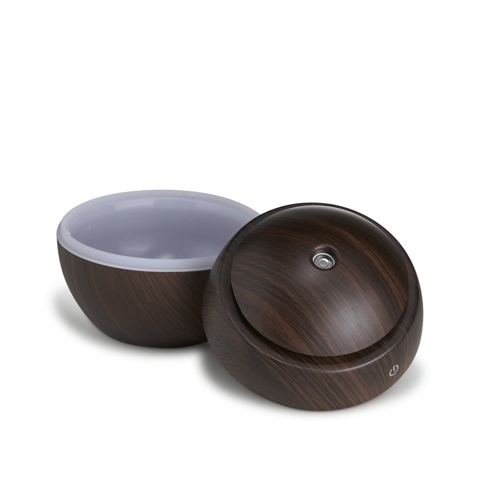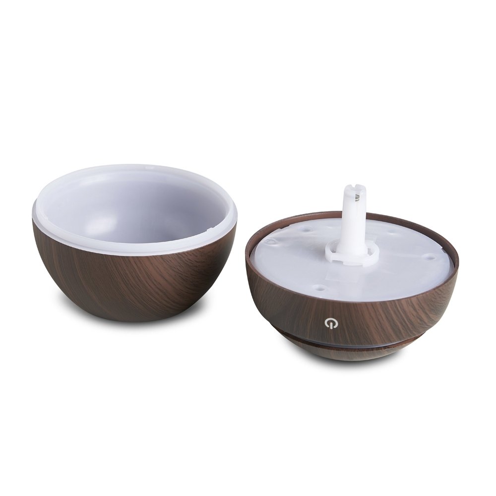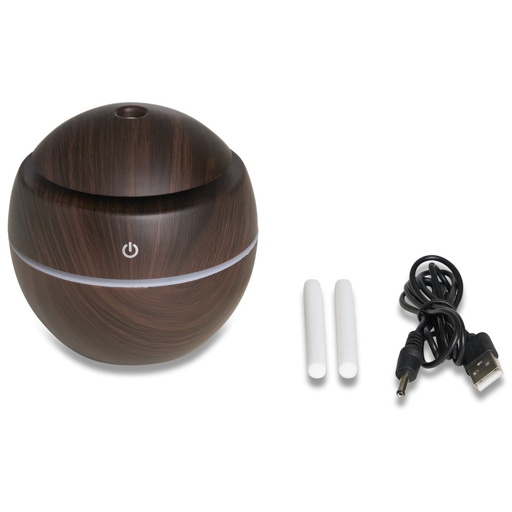 Mini umidificador ultrassônico com led que muda de cor. Acompanha filtro de algodão e um cabo USB. Capacidade para 130ml de água. Produzido em plástico e revestido por adesivo caracterizando madeira. Taxa de tensão DC5V e Taxa de consumo de 2W. O produto não retém energia, funciona somente com o cabo USB conectado a um meio de alimentação de energia. Obs.: para conservação do produto é recomendável utilizar água filtrada e não deve ser usado essências!