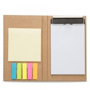 Bloco de anotações ecológico com calculadora. Bloco de kraft com calculadora solar de 8 dígitos acoplada na capa; parte interna com bloco amarelo de aproximadamente 26 folhas; seis bloco auto-colantes coloridos com aproximadamente 35 folhas; bloco branco com aproximadamente 50 folhas sem pauta, possui trava superior metálica de pressão.