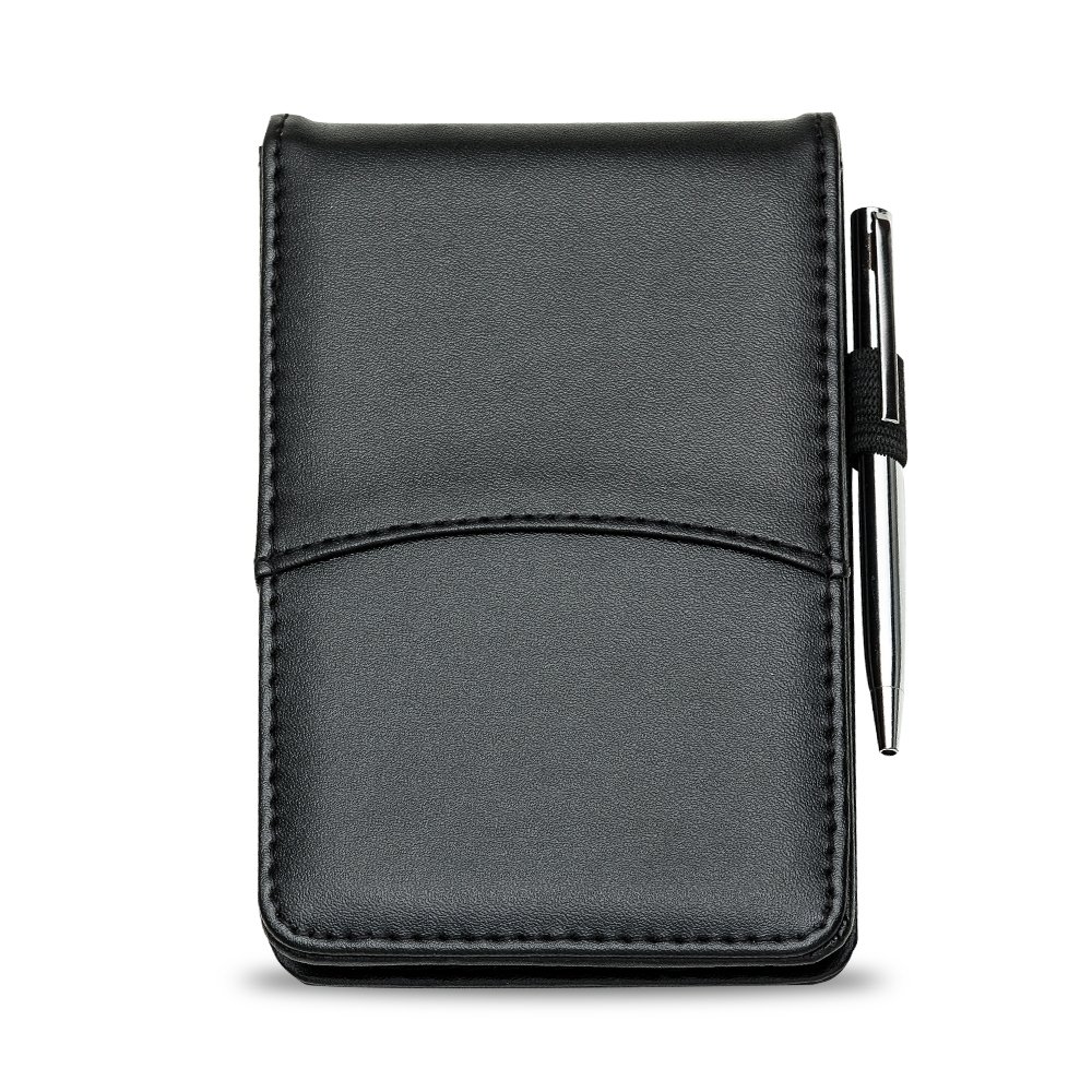 Bloco de anotações: Com capa de couro sintético. Possui calculadora solar plástica de 8 dígitos, uma caneta plástica com clip de metal acionada por giro e bloco de anotações pautado(verso branco) com aproximadamente 30 folhas.