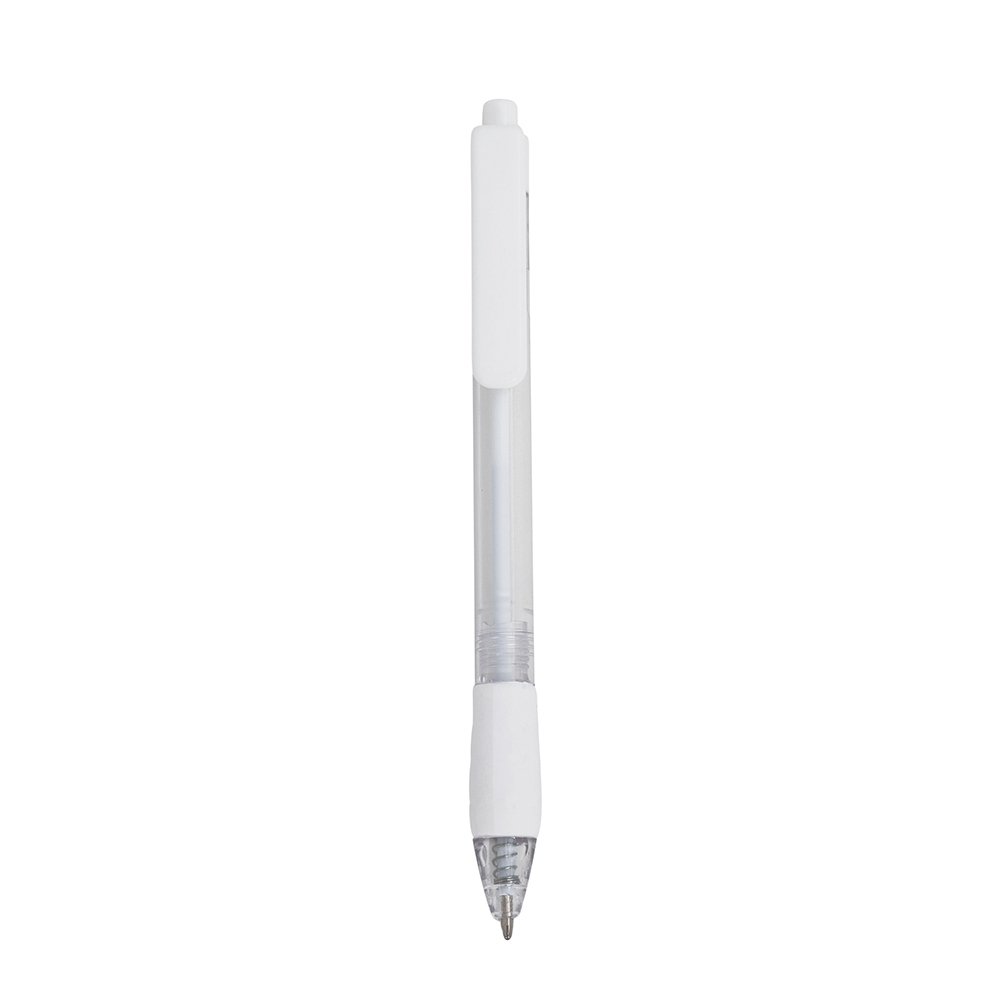 Caneta plástica com detalhe emborrachado, carga esferográfica azul e acionamento por clique.
