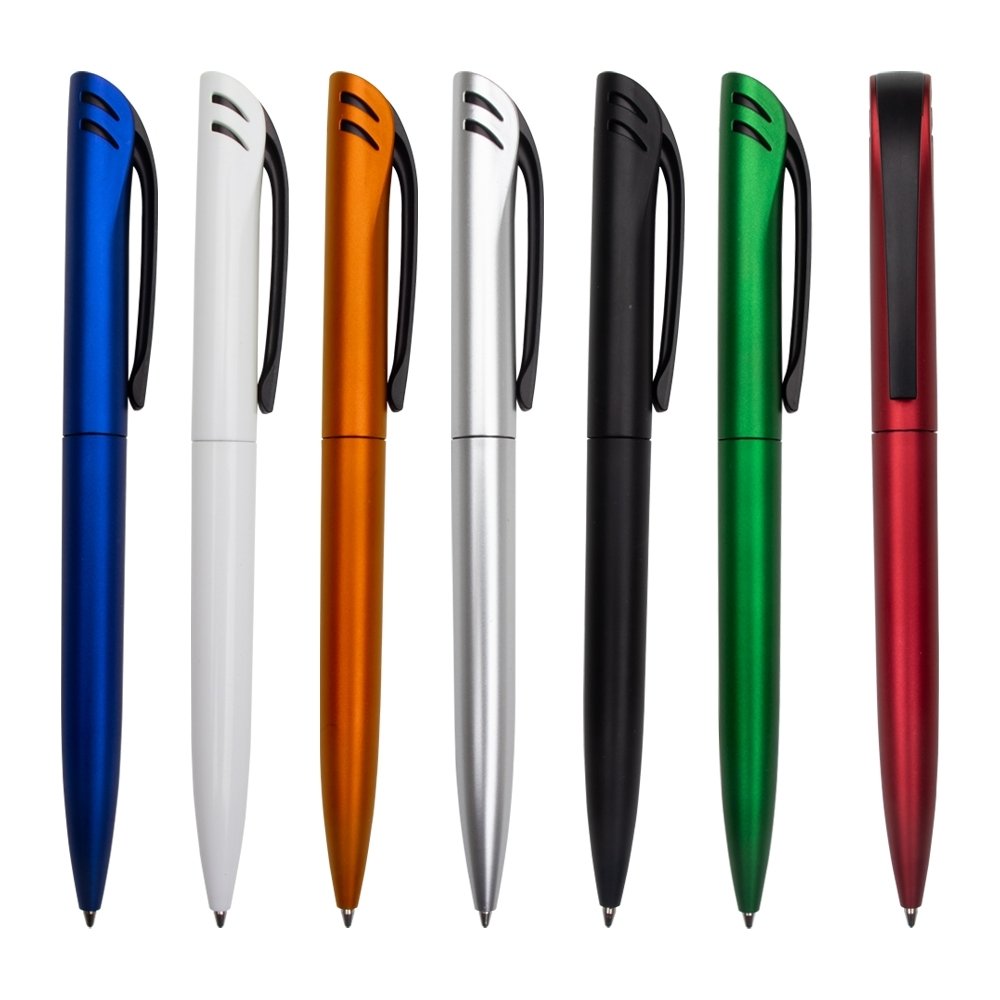 Caneta Plástica com acionamento por rotação e carga esferográfica azul 1.0mm. OBS.: PEDIDOS MÍNIMO DE 50 PEÇAS! Largura :  1,5 cm Comprimento :  14,2 cm Medidas aproximadas para gravação (CxL):  4 cm x 0,5 cm Peso aproximado (g):  9