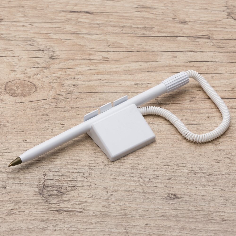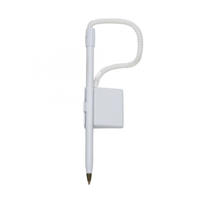 Caneta balcão plástica inteira branca com detalhe colorido. Acionador com relevo, possui traseira com adesivo auto-colante. QUANTIDADE MÍNIMA DE 100 PEÇAS!