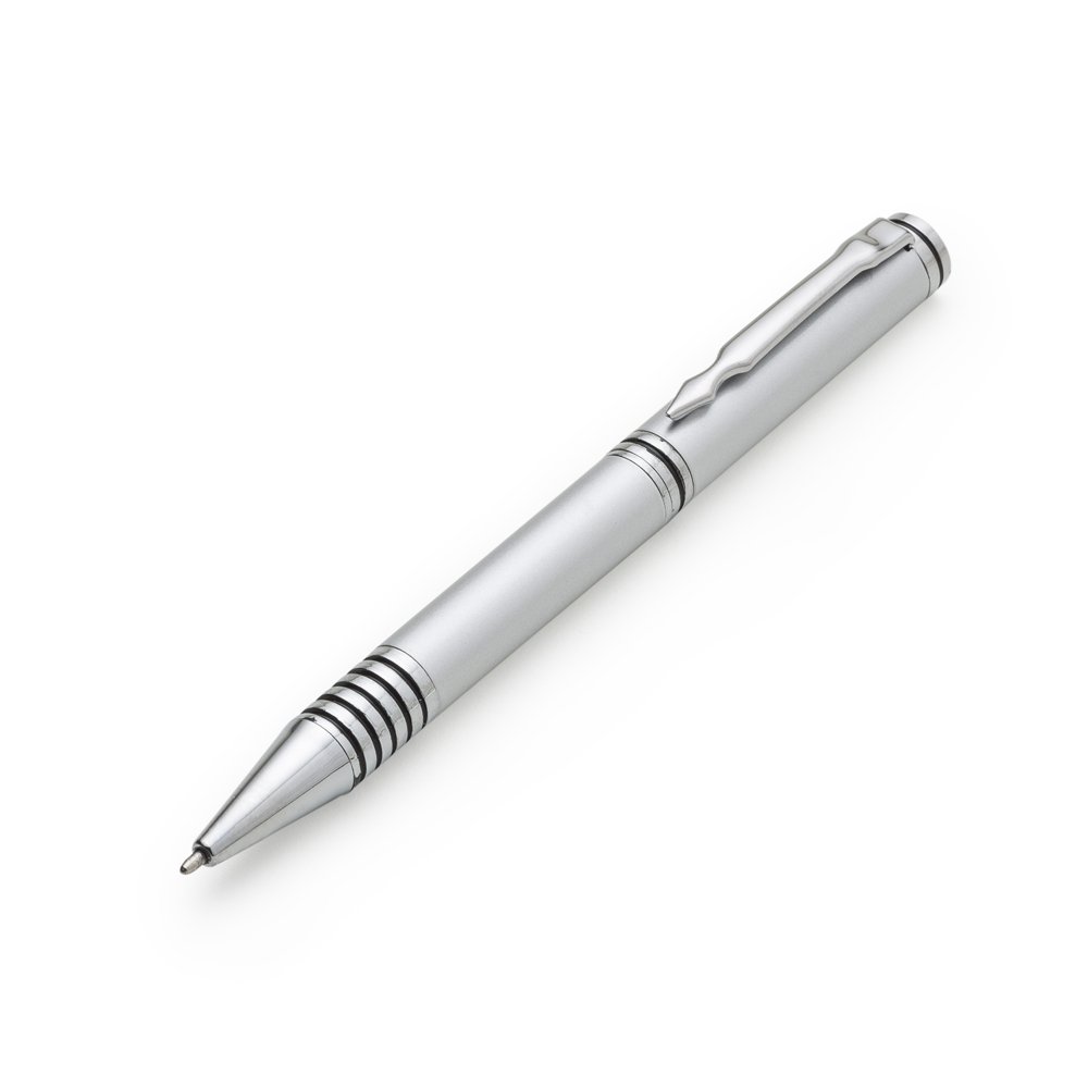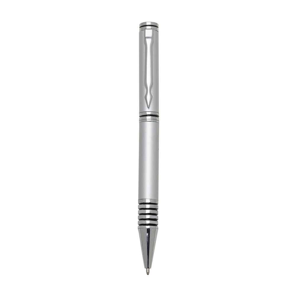 Caneta metálica com carga esferográfica azul e acionamento por rotação.