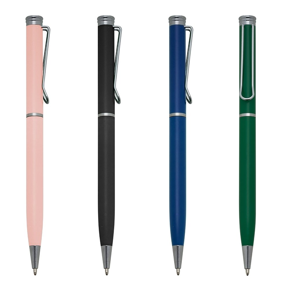 Caneta metálica com carga esferográfica azul e acionamento por rotação.