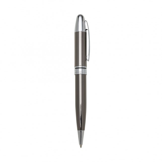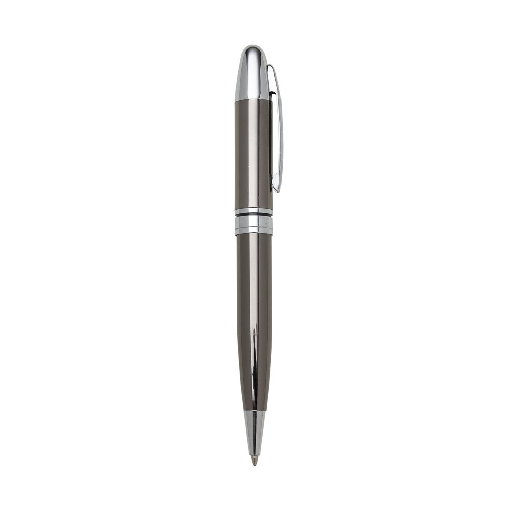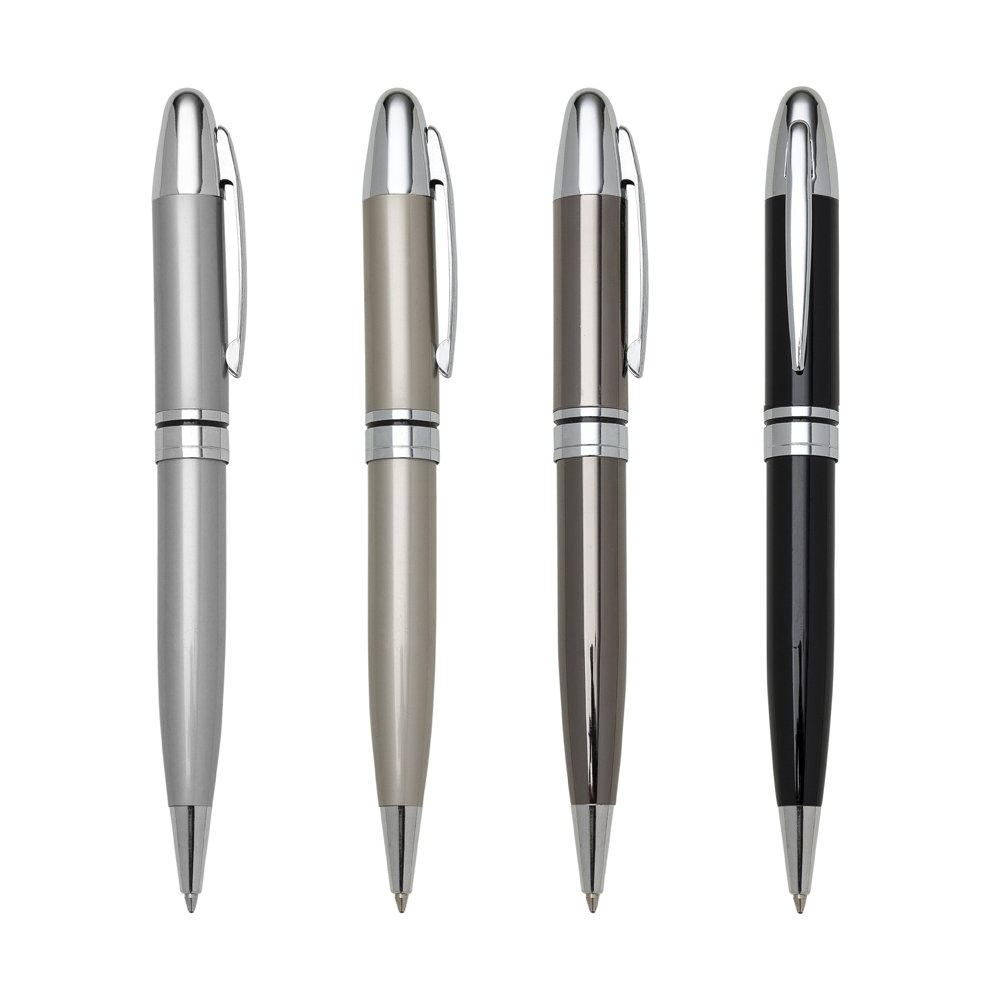 [vc_row][vc_column width=”2/3″]n[vc_column_text]Caneta metal inteira colorida com detalhes prata. Clip metal e anel central possui: anel fino prata, anel preto fino e um anel maior prata com relevo. Aciona por giro. n Largura : 1,6 cmn n n n Comprimento : 14 cmn Medidas aproximadas para gravação (CxL): 3,7 cm x 1,2 cmn n Peso aproximado (g): 30n