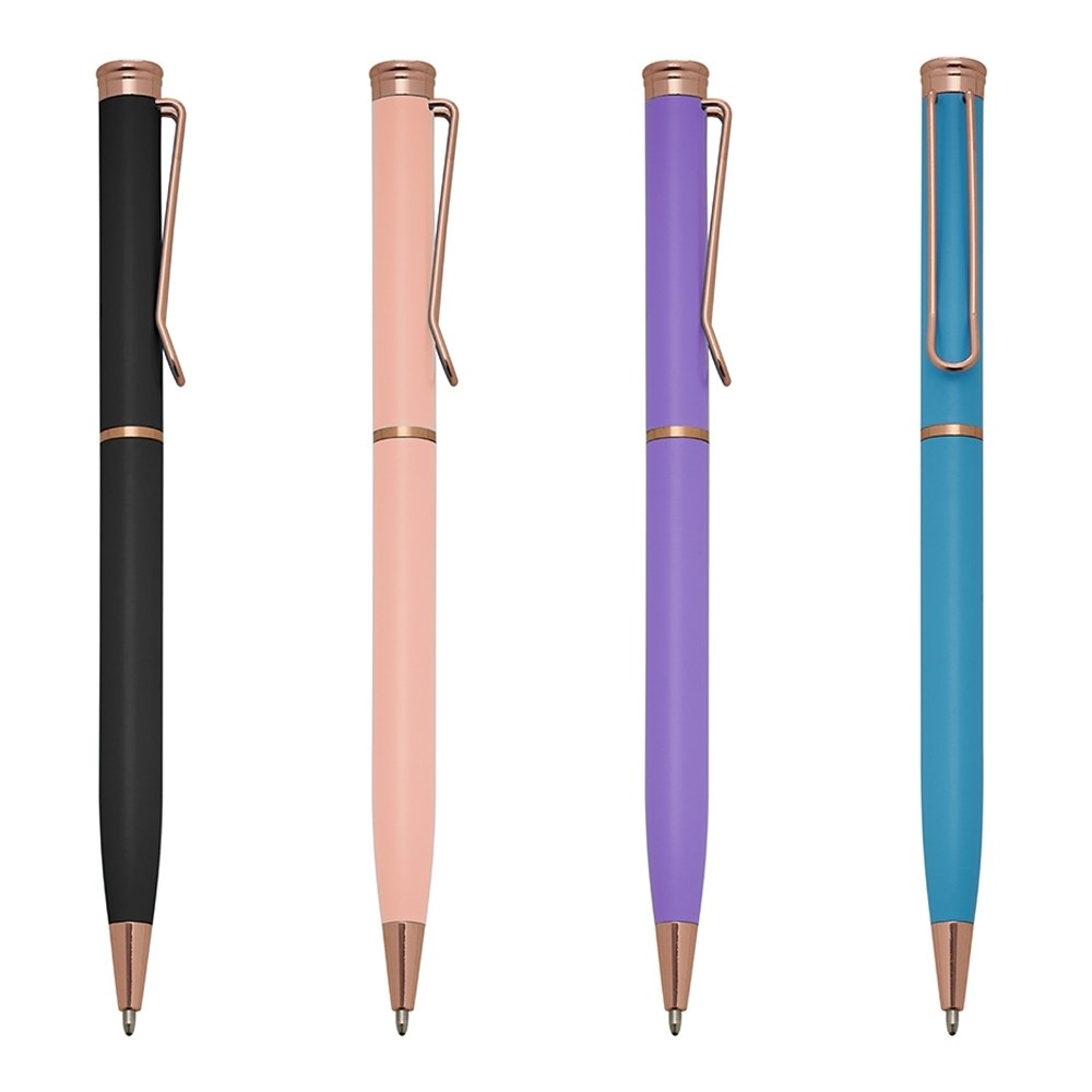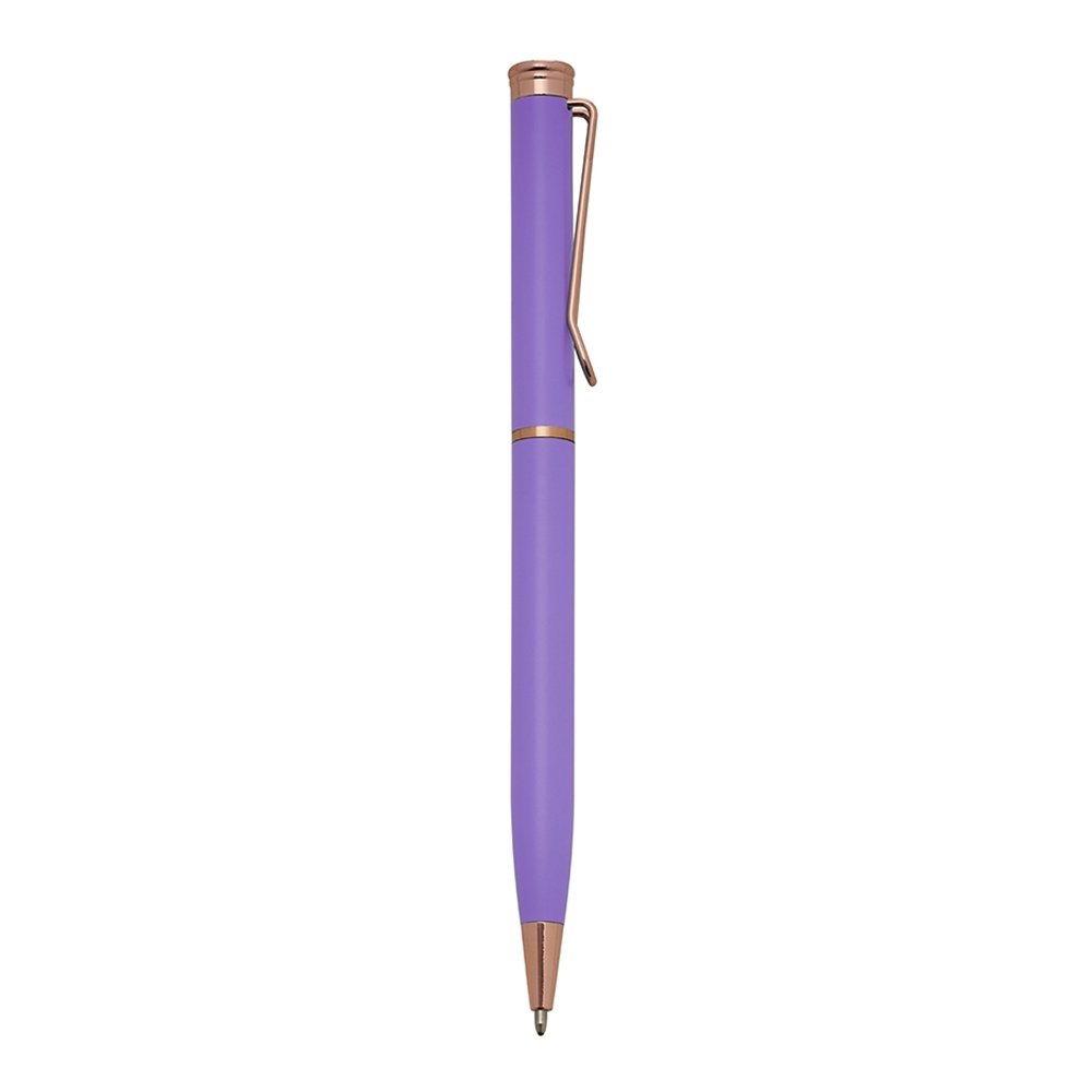 Caneta metálica com carga esferográfica azul e acionamento por rotação.