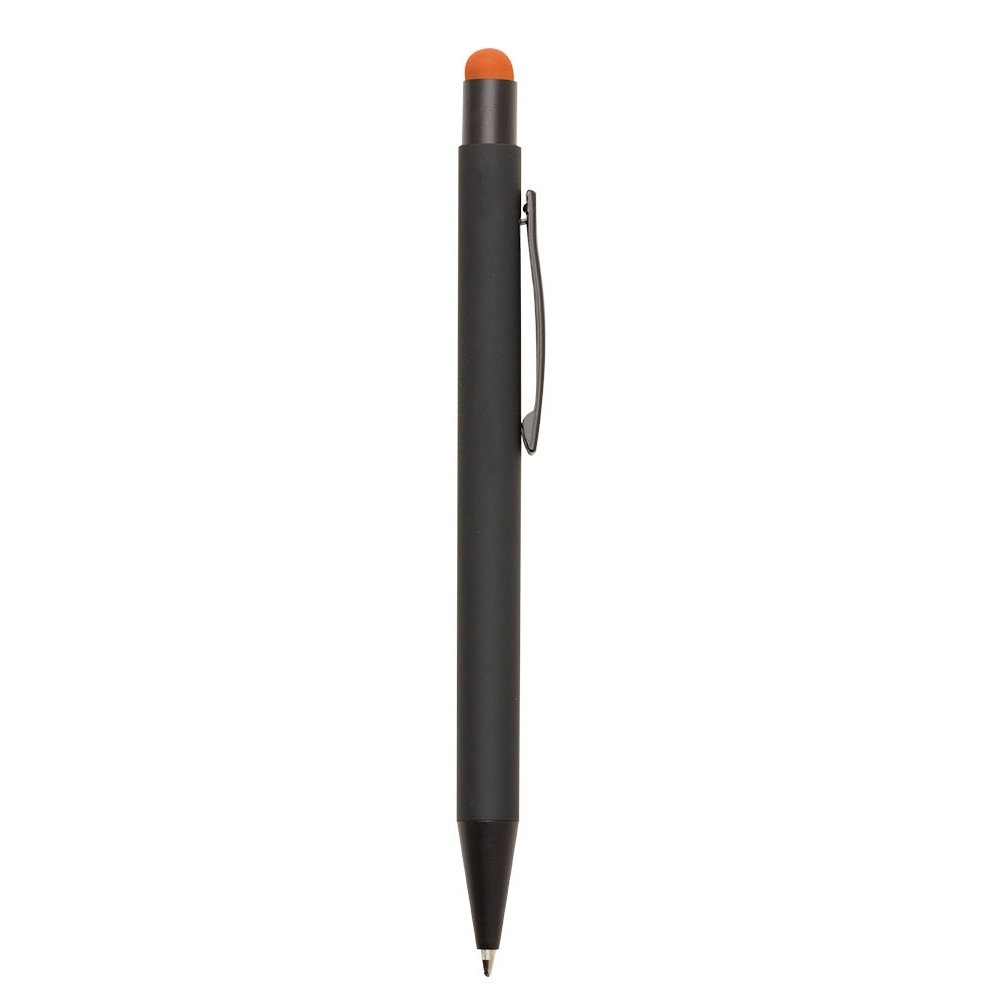 Caneta metal com ponteira touch colorida e pintura em preto fosco. Quando personalizada, a gravação possuirá a mesma cor da borracha touch. OBS.: A cor preta deverá ter a personalização amarelo/dourado. Aciona por clique.