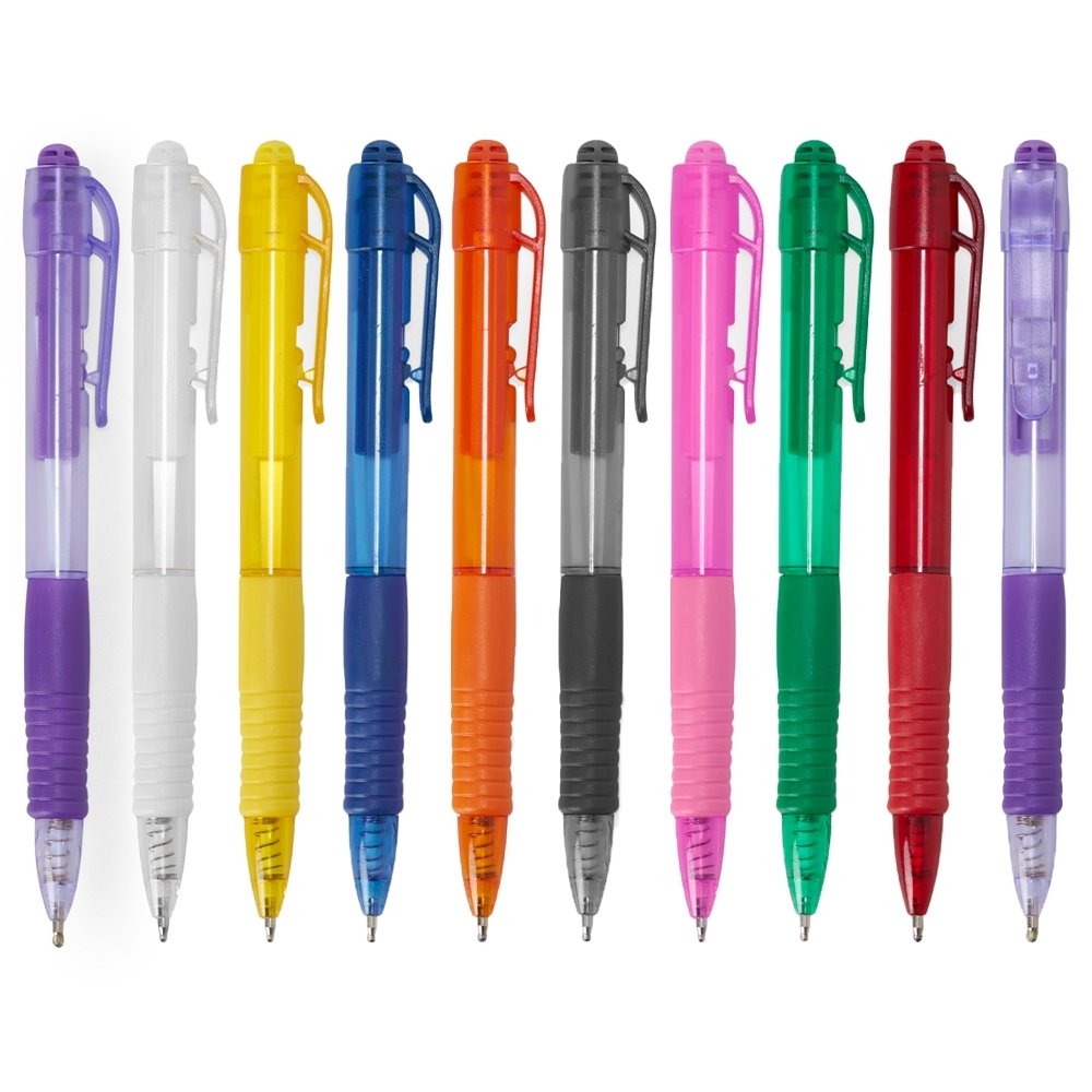 Caneta plástica com detalhe emborrachado, carga esferográfica azul e acionamento por clique. OBS.: PEDIDOS MÍNIMO DE 50 PEÇAS! Altura :  13,8 cm Largura :  1,5 cm Medidas aproximadas para gravação (CxL):  4,7 cm x 1,1 cm Peso aproximado (g):  8