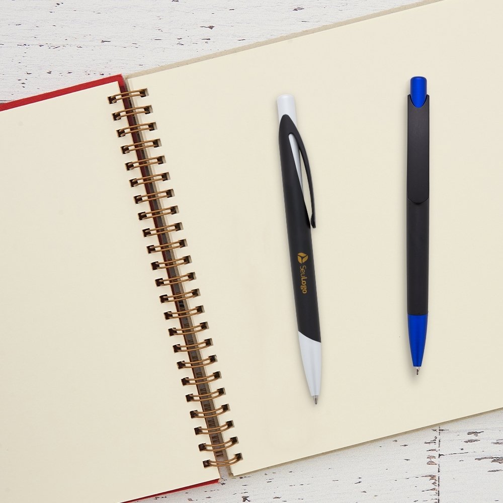 Caneta plástica com carga esferográfica azul e acionamento por clique.