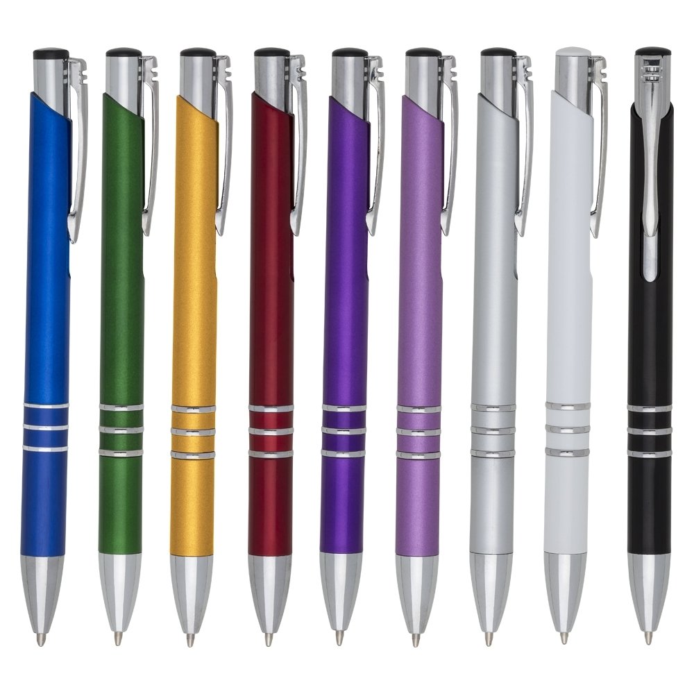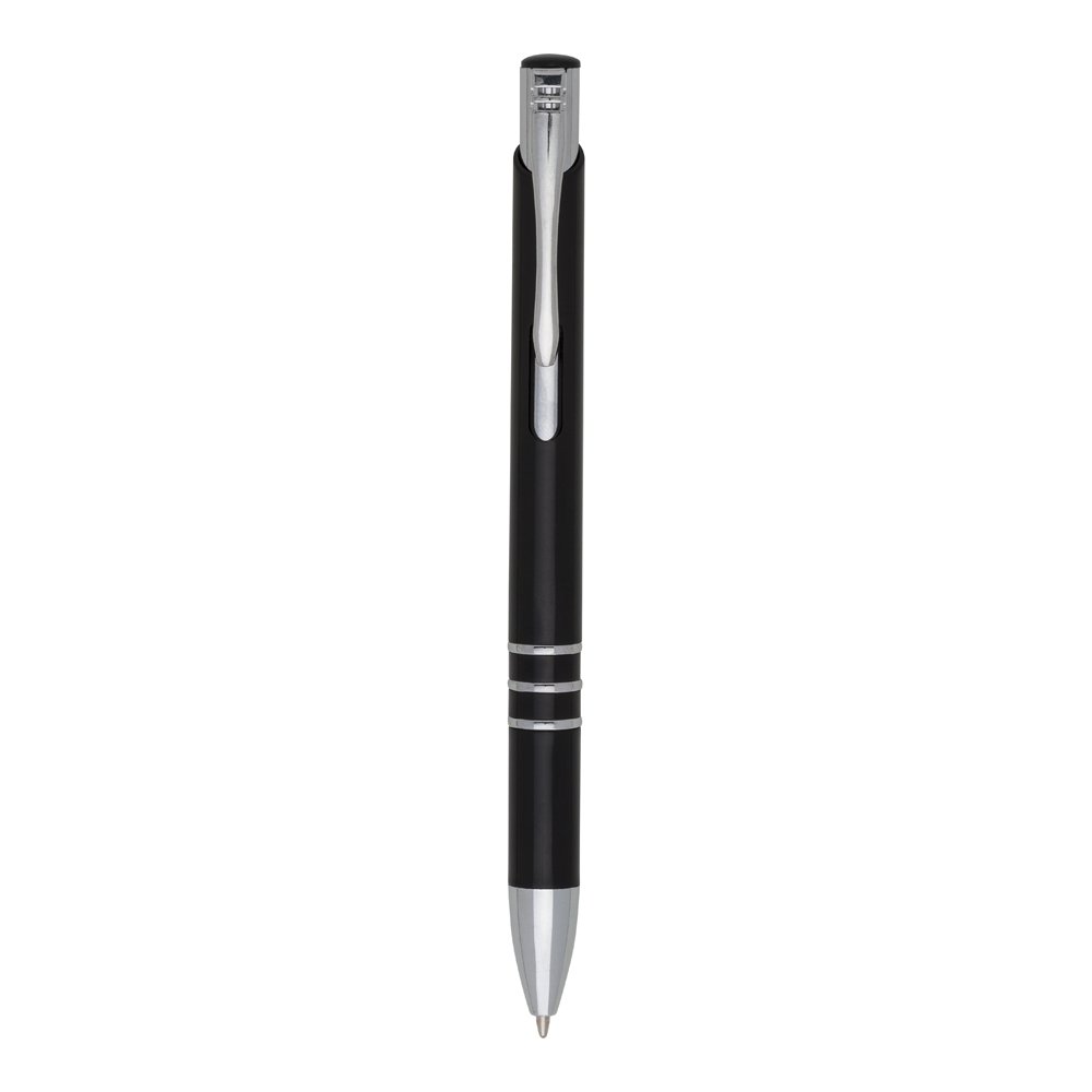 Caneta plástica com carga esferográfica azul e acionamento por clique. OBS.: PEDIDOS MÍNIMO DE 50 PEÇAS! Altura :  13,9 cm Largura :  1,4 cm Medidas aproximadas para gravação (CxL):  4 cm x 0,8 cm Peso aproximado (g):  9