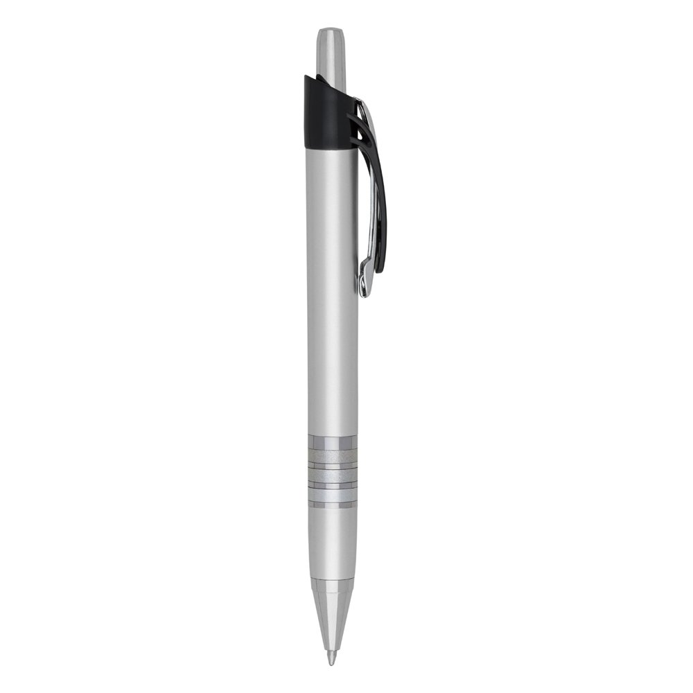 Caneta plástica com carga esferográfica azul e acionamento por clique.