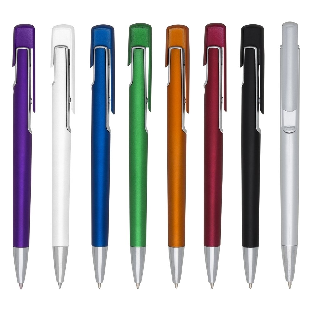 Caneta plástica com carga esferográfica azul e acionamento por clique. OBS.: PEDIDOS MÍNIMO DE 50 PEÇAS! Medidas aproximadas para gravação (CxL):  4,5 cm x 0,8 cm Tamanho total aproximado  (CxL):  14 cm x 1,3 cm Peso aproximado (g):  8