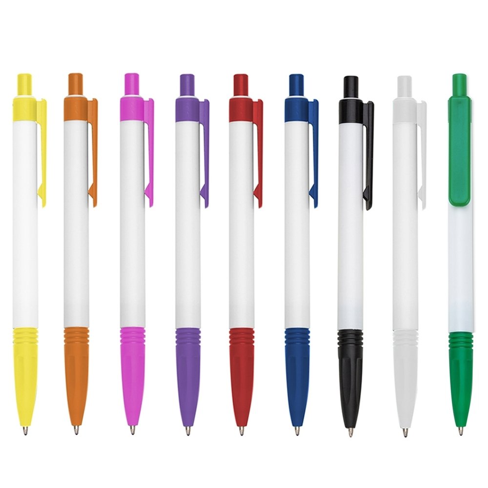 Caneta plástica com carga esferográfica azul e acionamento por clique.
