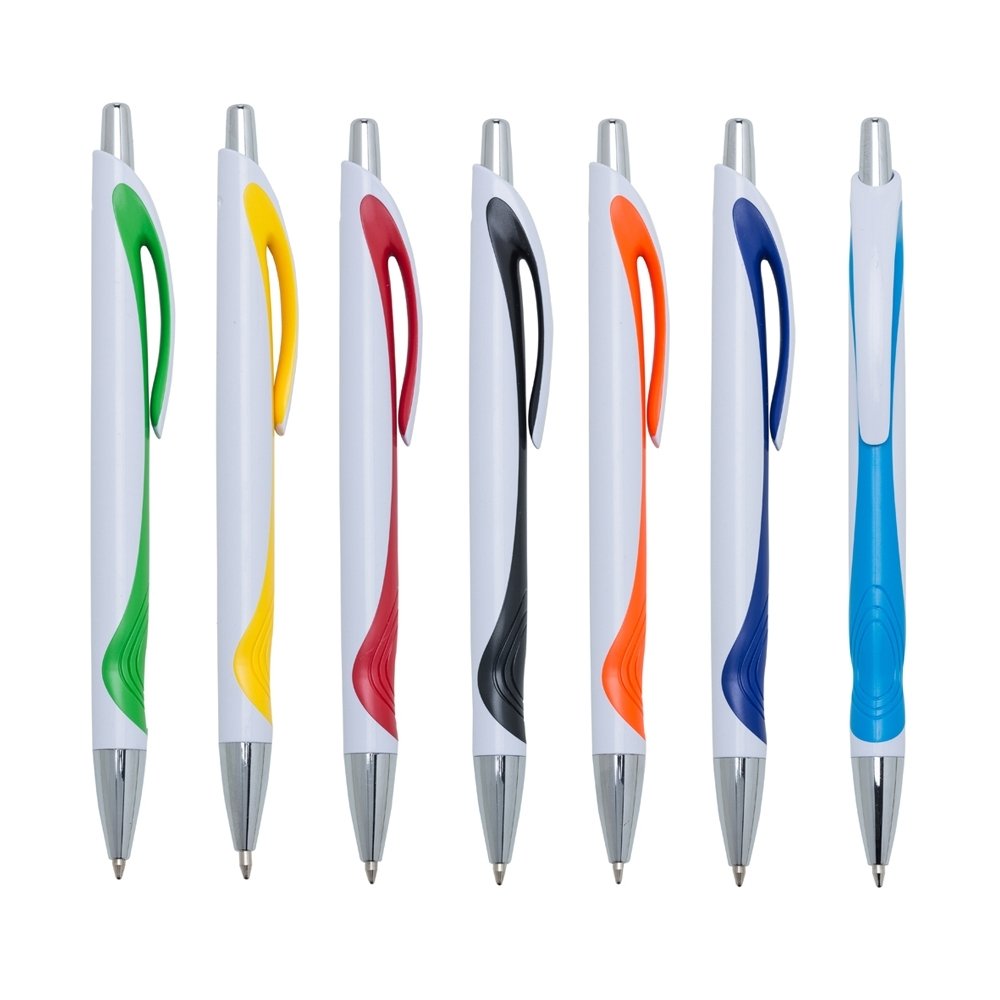 [vc_row][vc_column width=”2/3″]n[vc_column_text]Caneta plástica branca com detalhe colorido. Clip plástico com acionador e ponteira prata, aciona por clique. n n n n n n Medidas aproximadas para gravação (CxL): 5 cm x 0,7 cmn Tamanho total aproximado (CxL): 13,9 cm x 1,6 cmn Peso aproximado (g): 10n