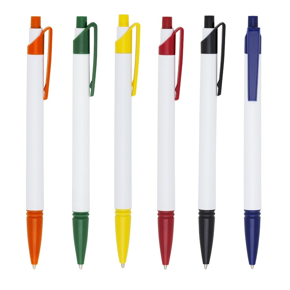[vc_row][vc_column width=”2/3″]n[vc_column_text]Caneta plástica corpo branco com detalhes coloridos. Possui relevo na ponteira, aciona por clique. n n n n n n Medidas aproximadas para gravação (CxL): 3 cm x 0,7 cmn Tamanho total aproximado (CxL): 13,9 cm x 1,4 cmn Peso aproximado (g): 6n