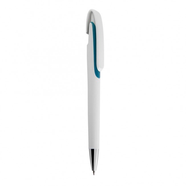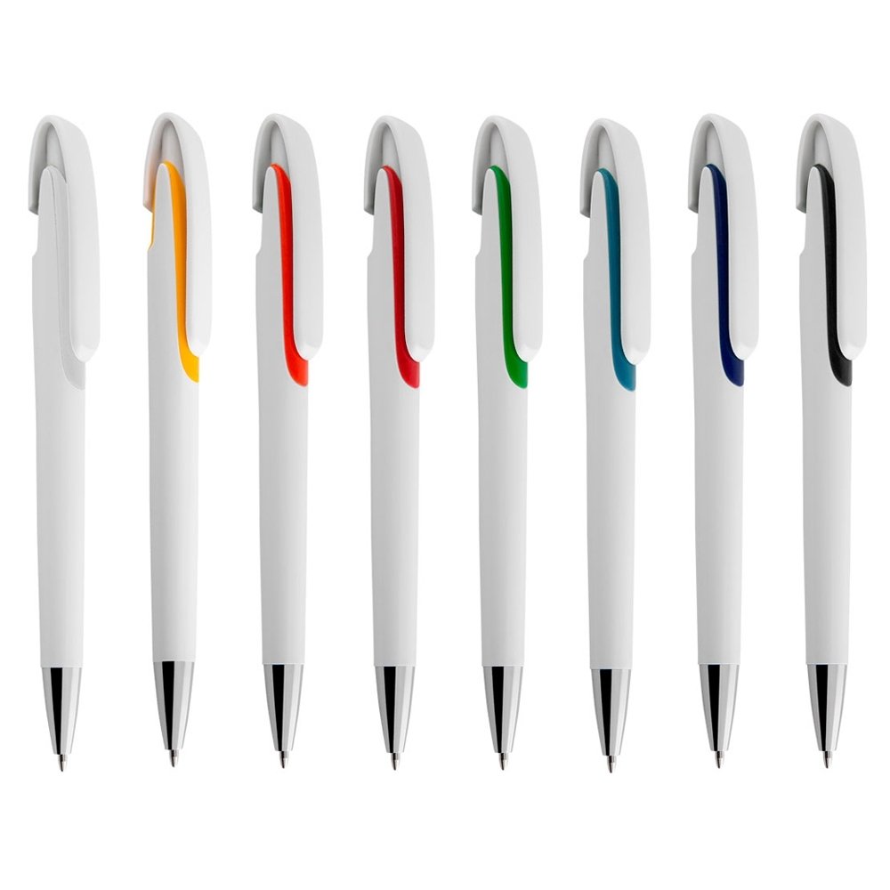 [vc_row][vc_column width=”2/3″]n[vc_column_text]Caneta plástica com pintura branca leitosa e detalhe superior colorido. Carga esferográfica azul e acionamento por clique.n
