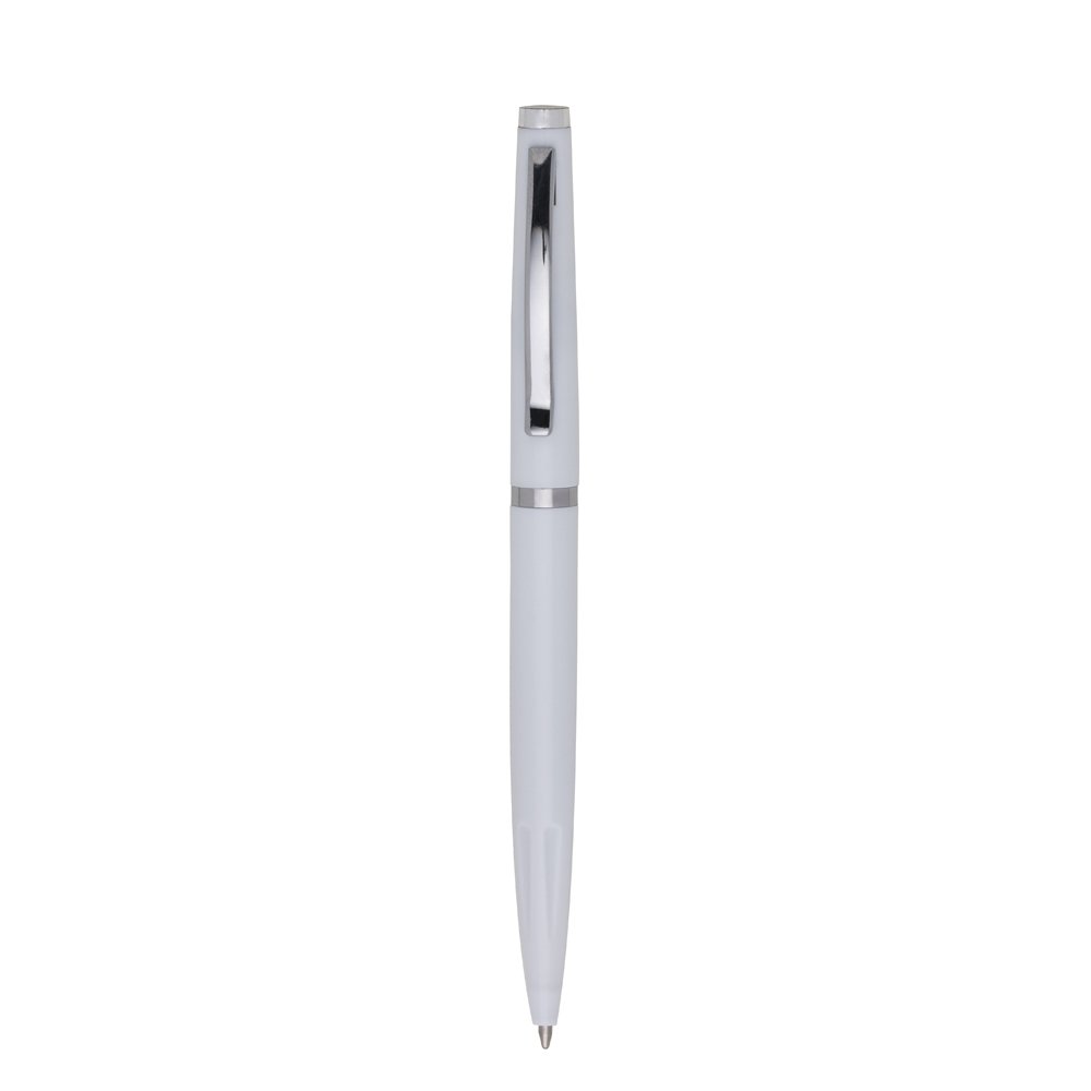 Caneta plástica com carga esferográfica azul e acionamento por rotação.