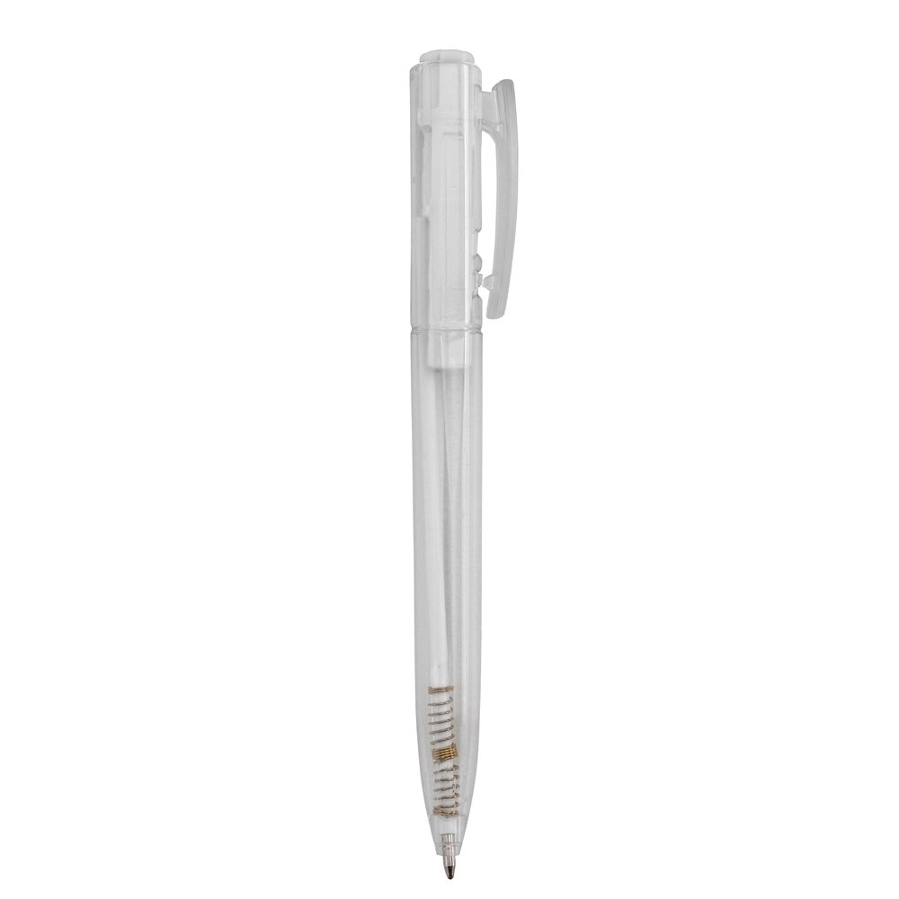 Caneta plástica com carga esferográfica azul e acionamento por clique. OBS.: PEDIDOS MÍNIMO DE 50 PEÇAS! Largura :  1,7 cm Comprimento :  13,6 cm Medidas aproximadas para gravação (CxL):  6,5 cm x 1 cm - clip 3,6 cm x 0,9 cm Peso aproximado (g):  8