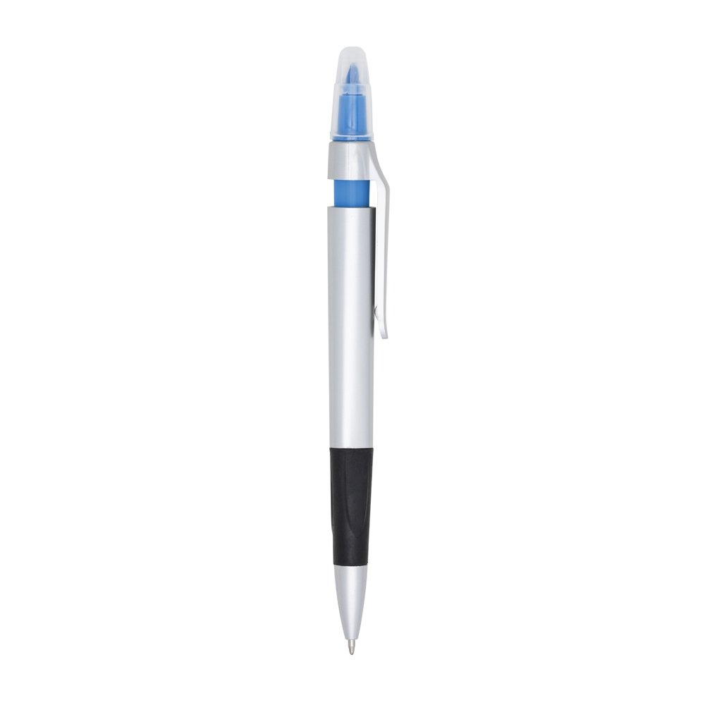 Caneta plástica com marca texto, contém detalhe emborrachado e tampa protetora para o marca