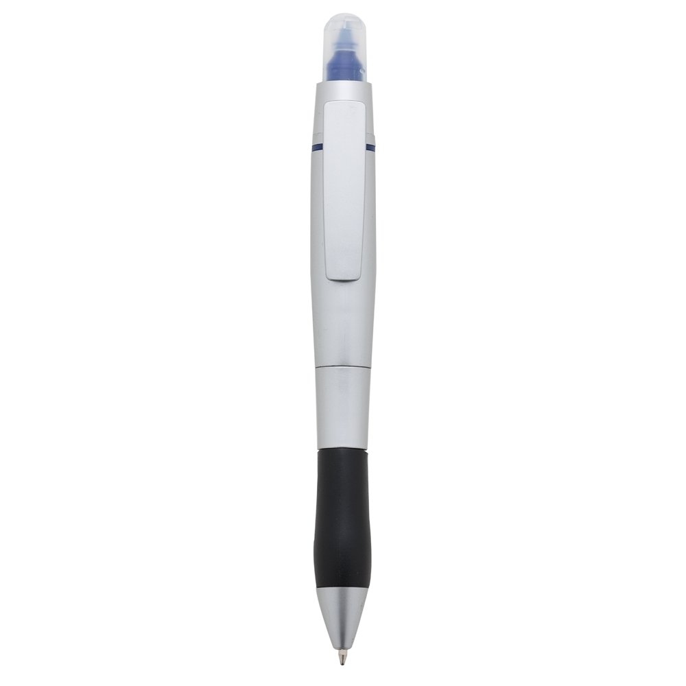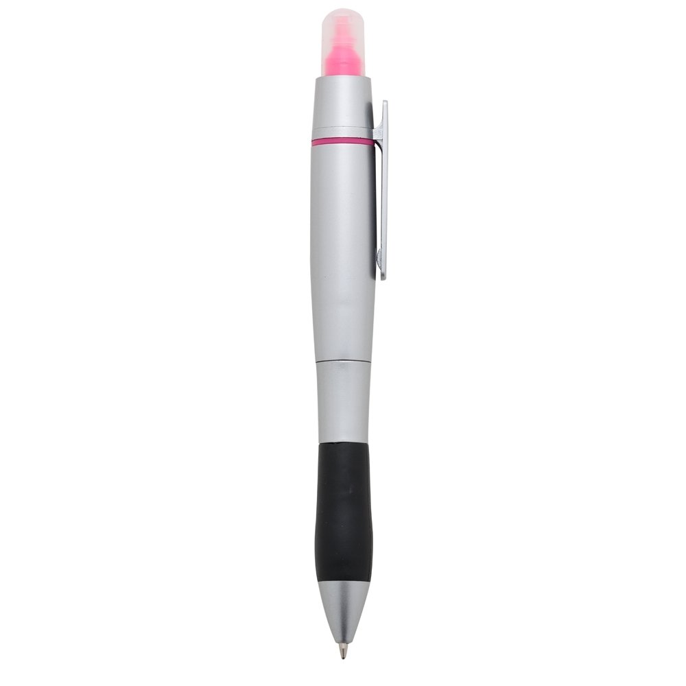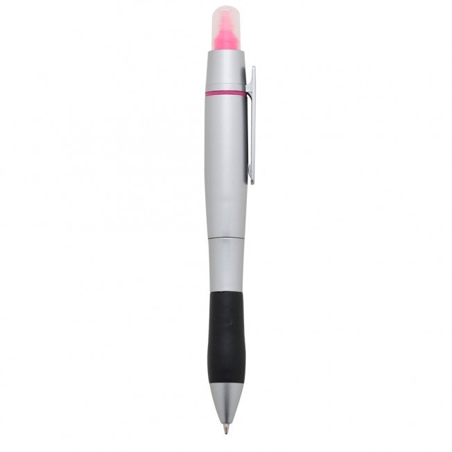 Caneta plástica esferográfica e marca texto, inteira prata com detalhe inferior preto emborrachado. Tampa protetora no marca texto, aciona por giro.