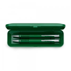 Conjunto caneta e lapiseira semi-metal e estojo plástico resistente: Estojo não é plano(apenas a parte central), caneta e lapiseira semi-metálicas inteiras coloridas com detalhes prata(acionadas por clique), clip de metal e parte inferior com 36 “bolinhas” pretas emborrachadas( possui anel na parte inferior). observação: