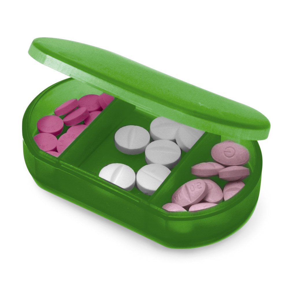 Porta comprimidos com 3 divisórias. Certificação EU Food Grade. 60 x 35 x 13 mm