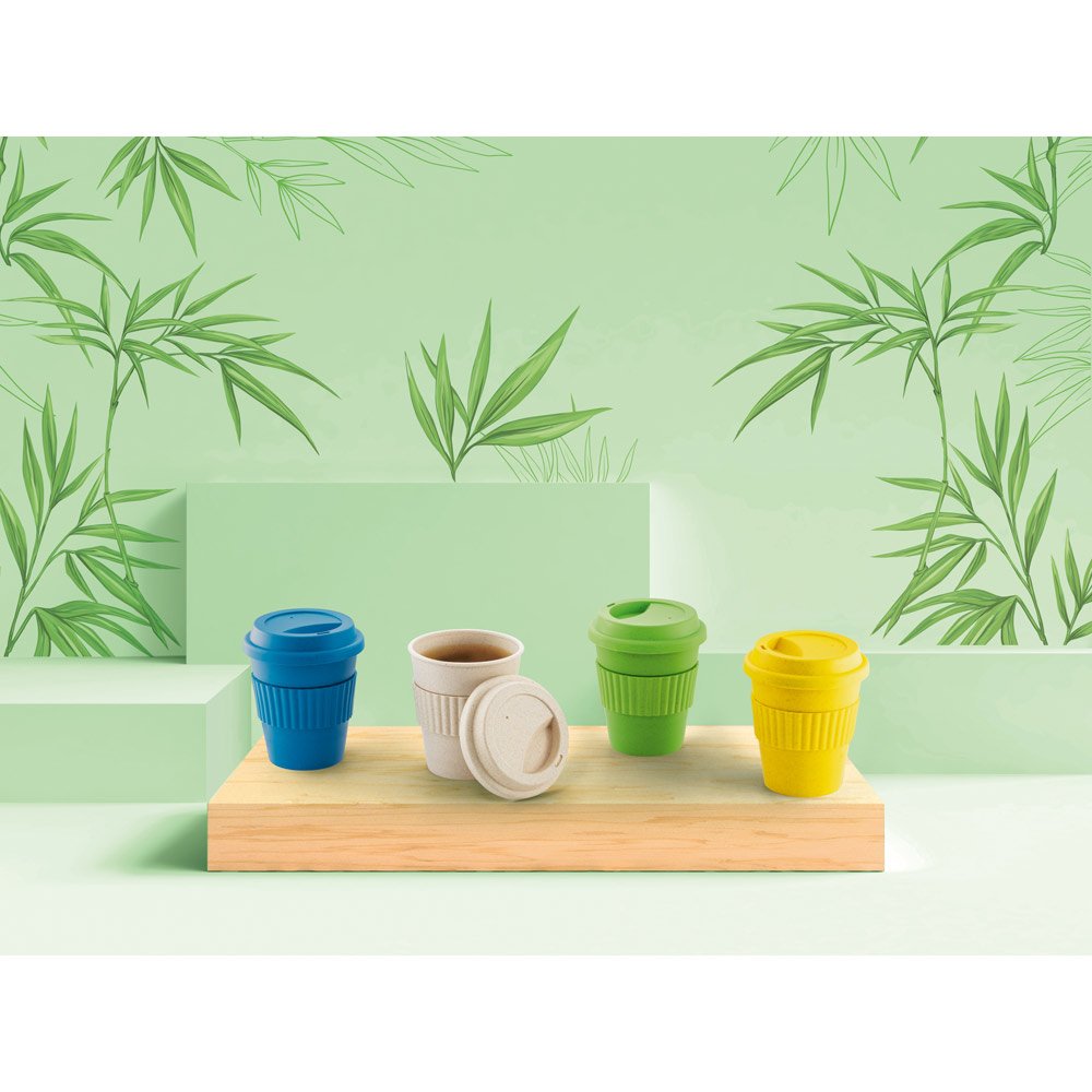 Copo de viagem em fibra de bambu (60%) e PP (40%), com tampa. Tira em silicone para facilitar o transporte de bebidas quentes. Capacidade até 380 mL. Certificação EU Food Grade. ø95 x 114 mm