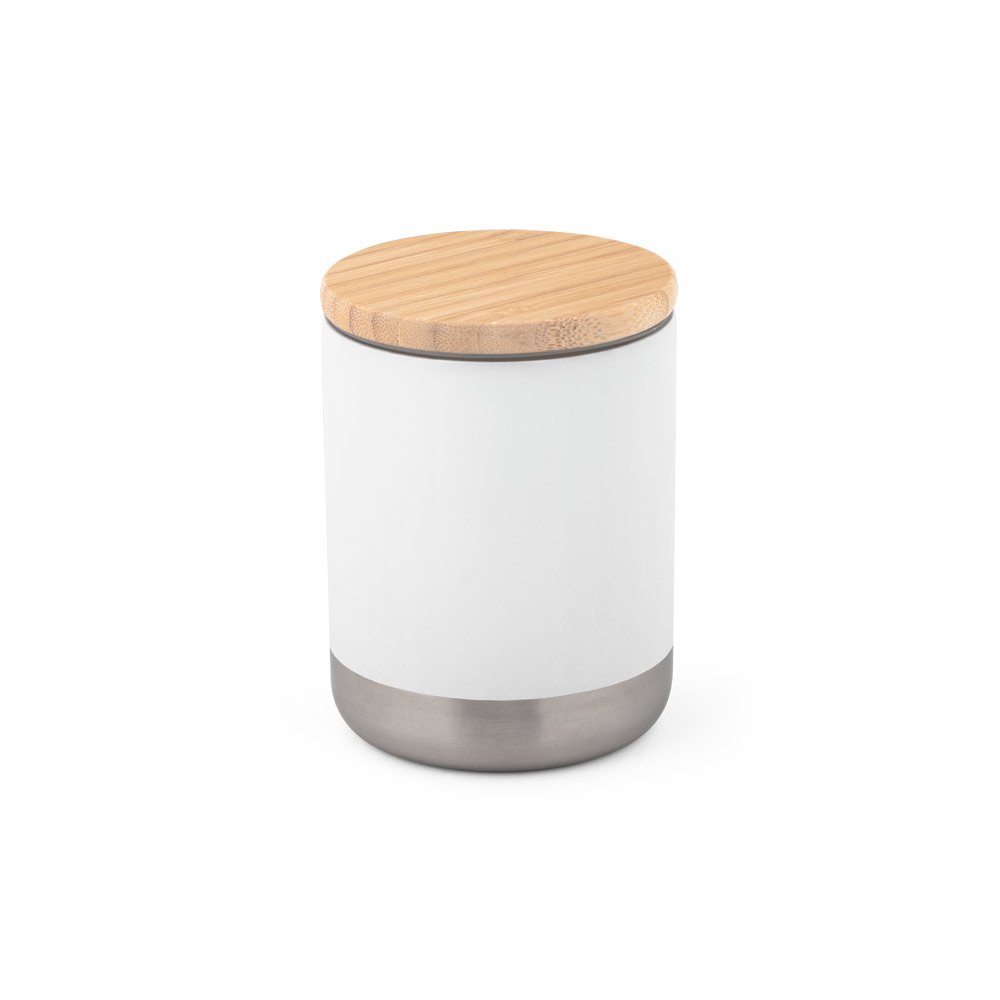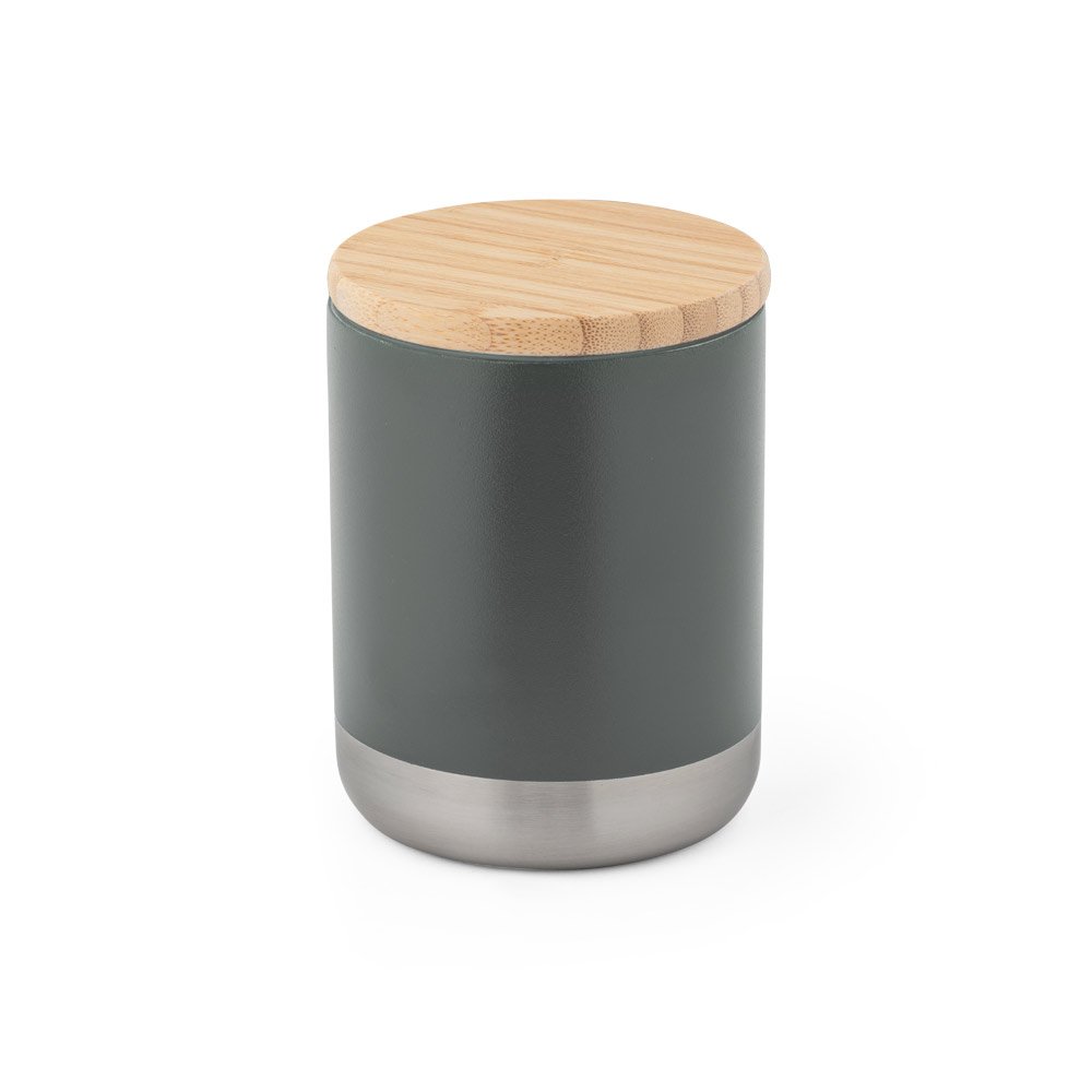 Copo de viagem em aço inox, térmico com parede dupla isolada a vácuo. Possui parede interna revestida de cobre e tampa em bambu com vedante de silicone para proteção extra. Capacidade até 370 mL. Preserva as bebidas quentes por 5 h e frias por 24 h. Contém revestimento em pó que lhe confere mais durabilidade e resistência. Fornecido em caixa presente de papel kraft reciclado. Certificação EU Food Grade. A cor e o resultado da impressão nos materiais naturais pode variar entre produtos. ø80 x 106 mm