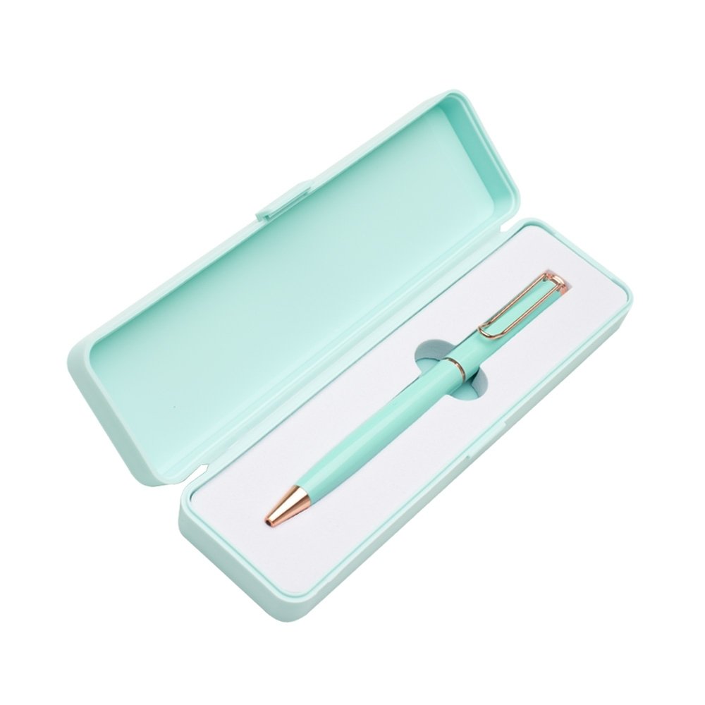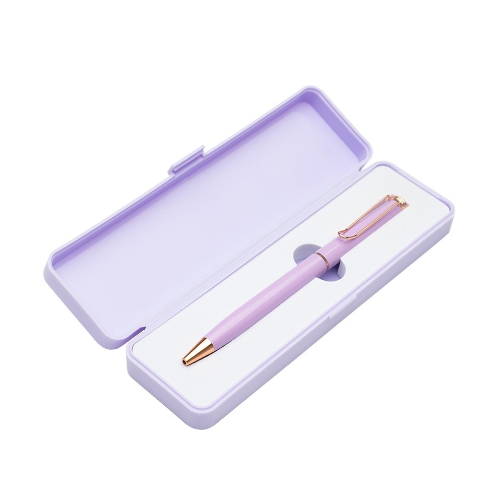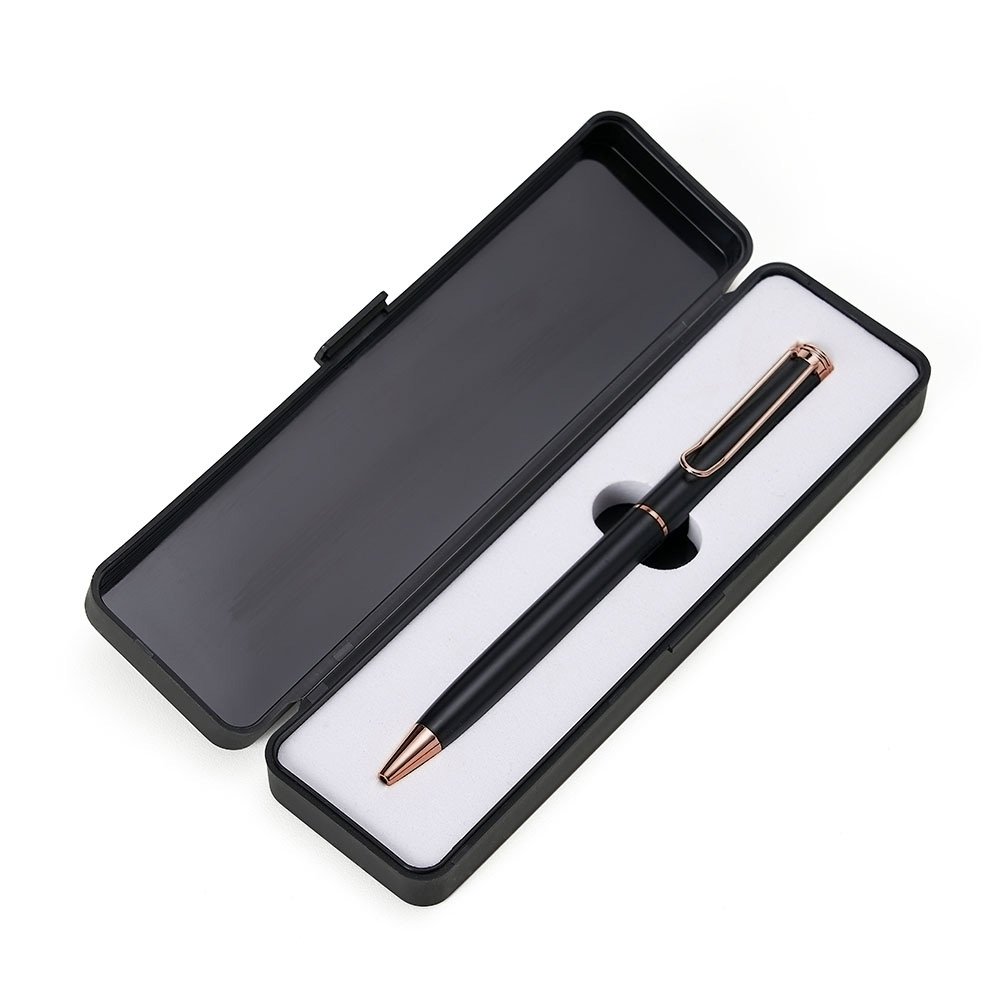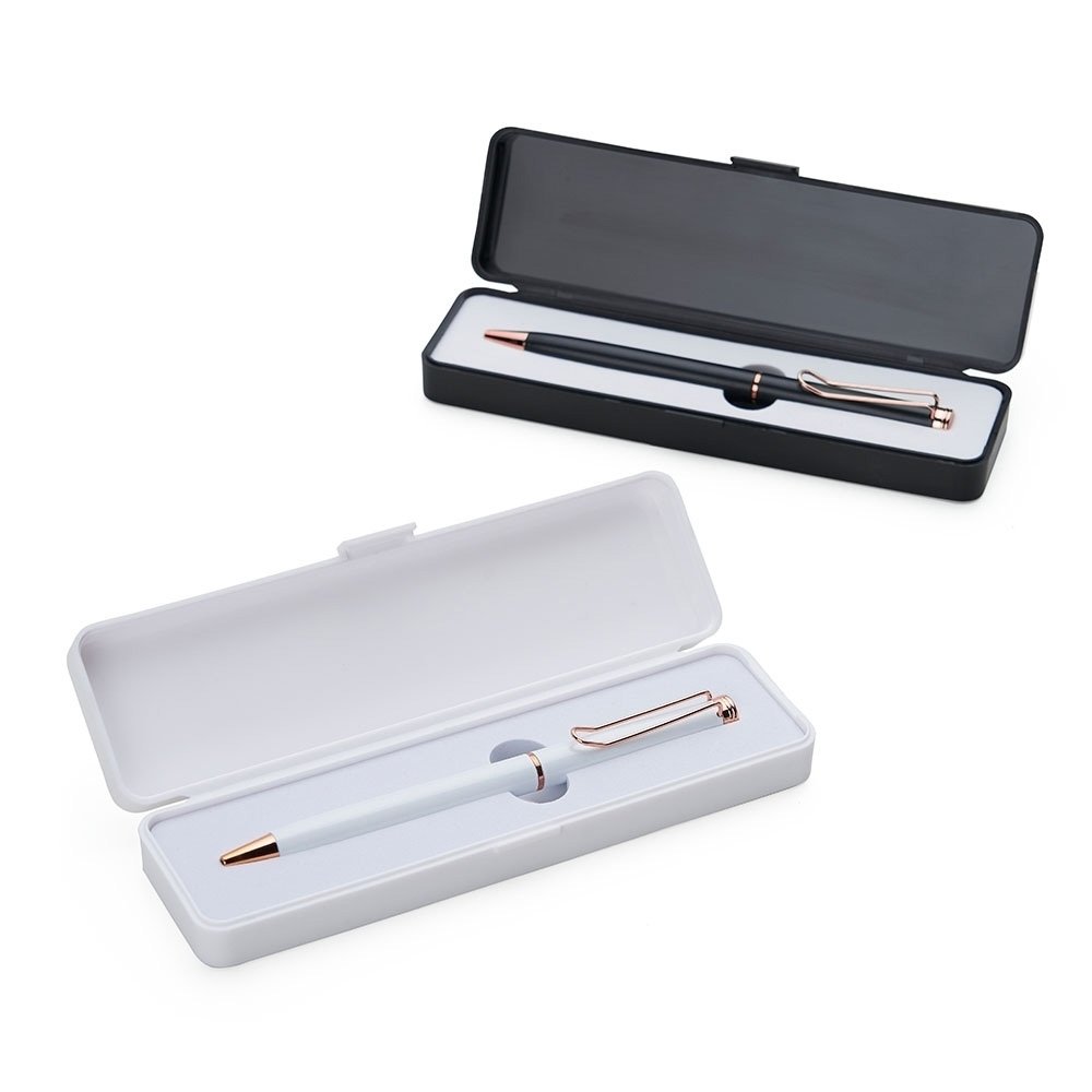 Conjunto caneta metálica com estojo de plástico e berço espumado. Carga esferográfica