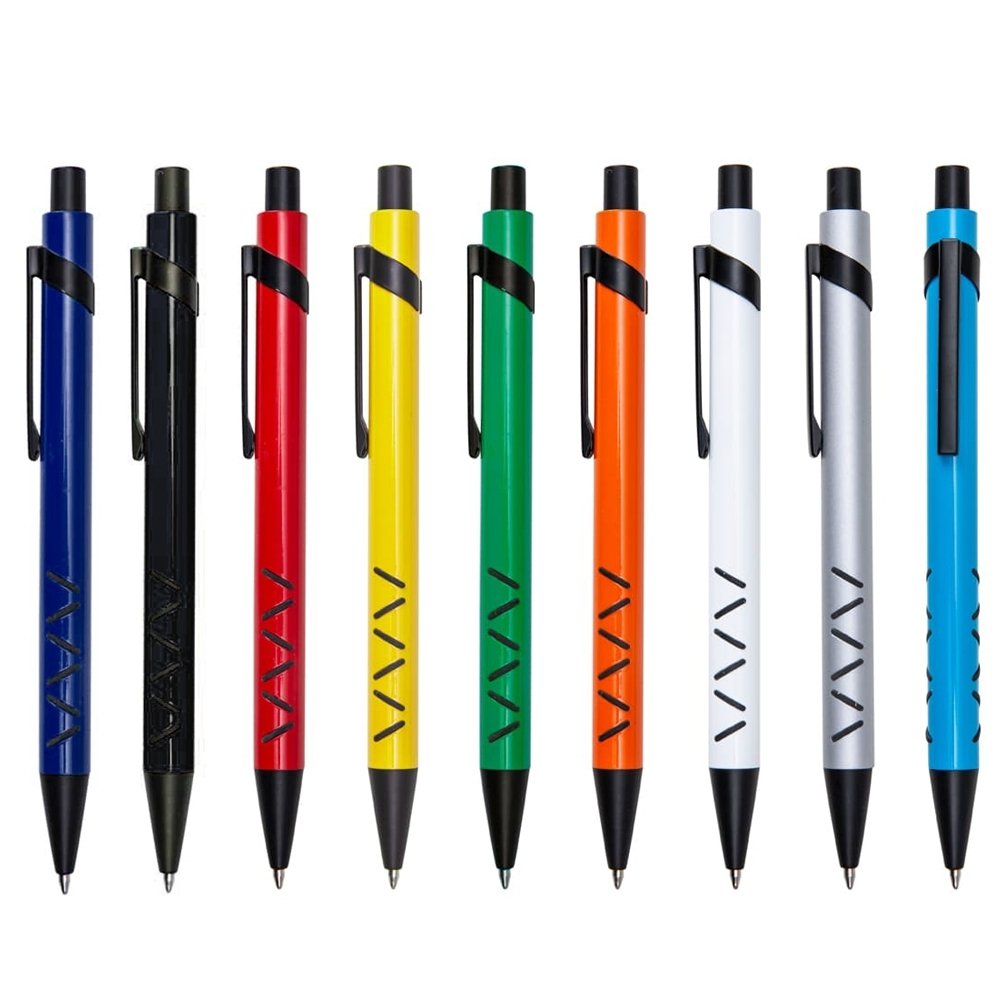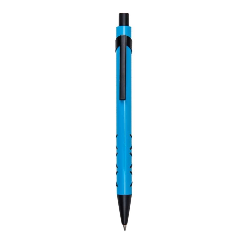 Caneta metálica com detalhe emborrachado, carga esferográfica azul e acionamento por clique. OBS.: PEDIDO APENAS MÚLTIPLO DE 50 PEÇAS!